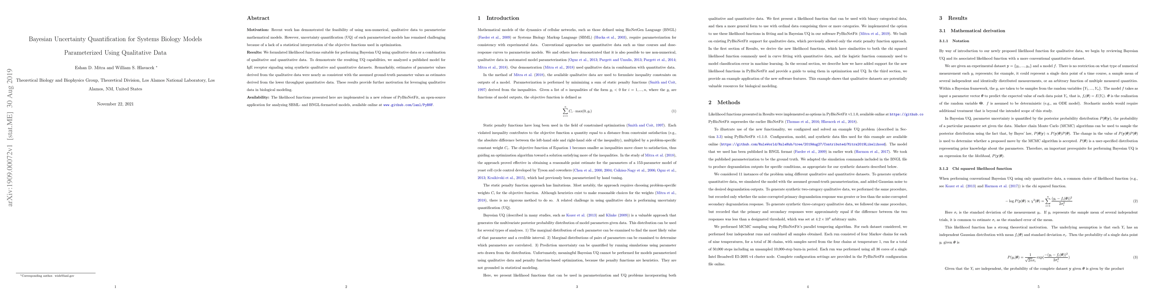 This paper proposes Bayesian uncertainty quantification methods for systems biology models parameterized using qualitative data, addressing the challenge of lack of statistical interpretation in optimization. The study demonstrates the effectiveness of these methods using a model for IgE receptor signaling, showing comparable accuracy of qualitative data to quantitative data.
