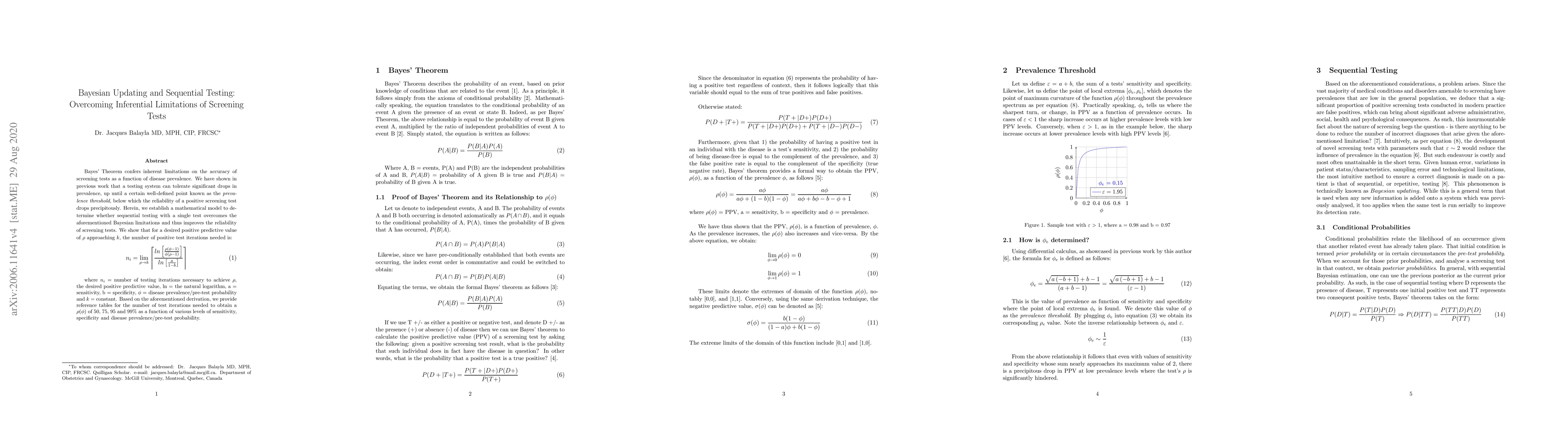 This paper develops a mathematical model to determine if sequential testing can improve the reliability of screening tests by overcoming Bayesian limitations tied to disease prevalence. The model provides reference tables for the number of test iterations needed to achieve desired positive predictive values as a function of sensitivity, specificity, and disease prevalence.