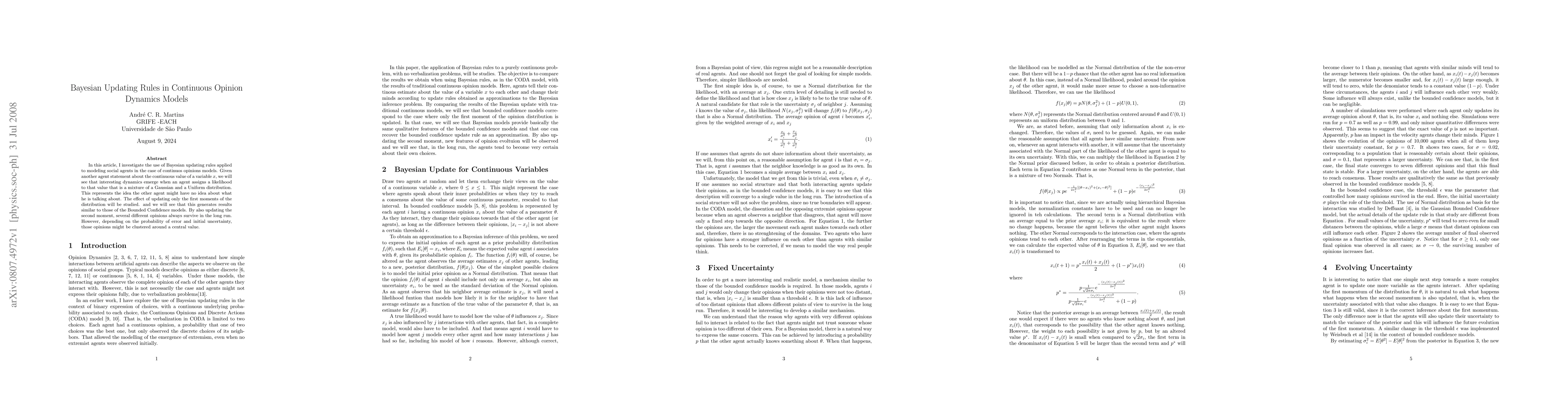 This paper explores Bayesian updating rules in continuous opinion dynamics, showing that combining Gaussian and Uniform distributions can model uncertainty in social agents' opinions. Updating both first and second moments leads to diverse long-term opinions, with clustering depending on error probability and initial uncertainty.