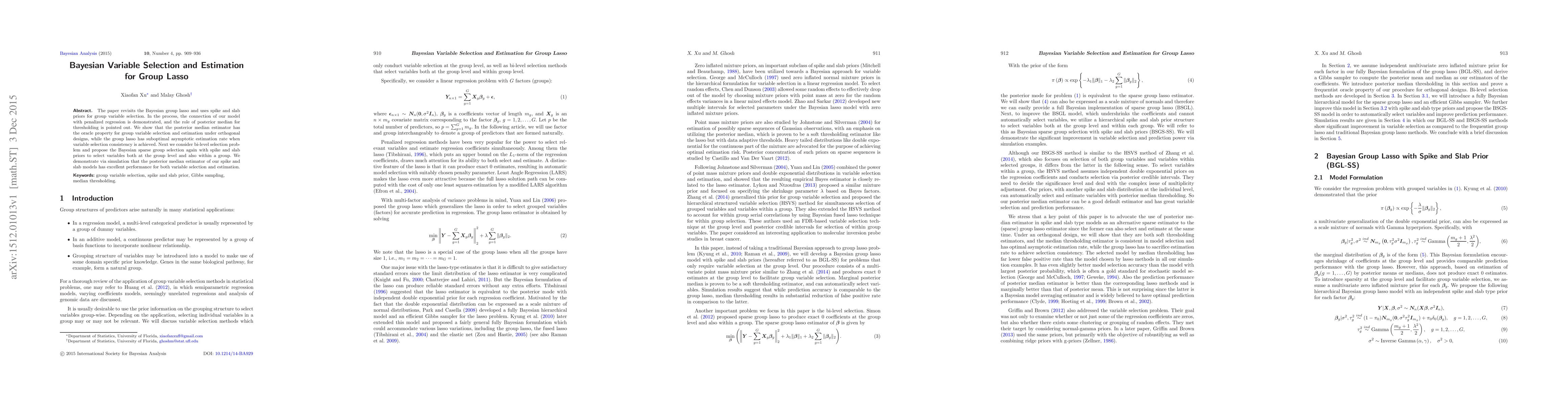 This paper proposes a Bayesian approach using spike and slab priors for group variable selection and estimation, demonstrating the oracle property of the posterior median estimator. It also introduces a bi-level selection method and shows through simulations that the posterior median estimator performs well in both variable selection and estimation.
