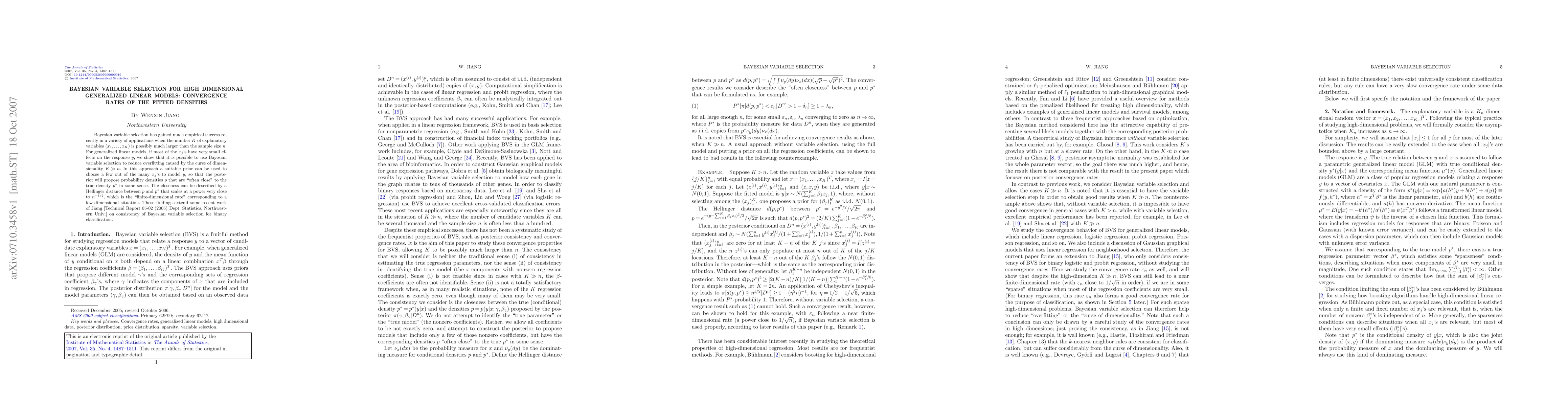 This paper investigates Bayesian variable selection for high-dimensional generalized linear models, demonstrating that it can effectively reduce overfitting when the number of variables is much larger than the sample size. The study shows that the fitted densities converge at a rate close to $n^{-1/2}$, akin to the "finite-dimensional rate," indicating the method's effectiveness in low-dimensional approximations.