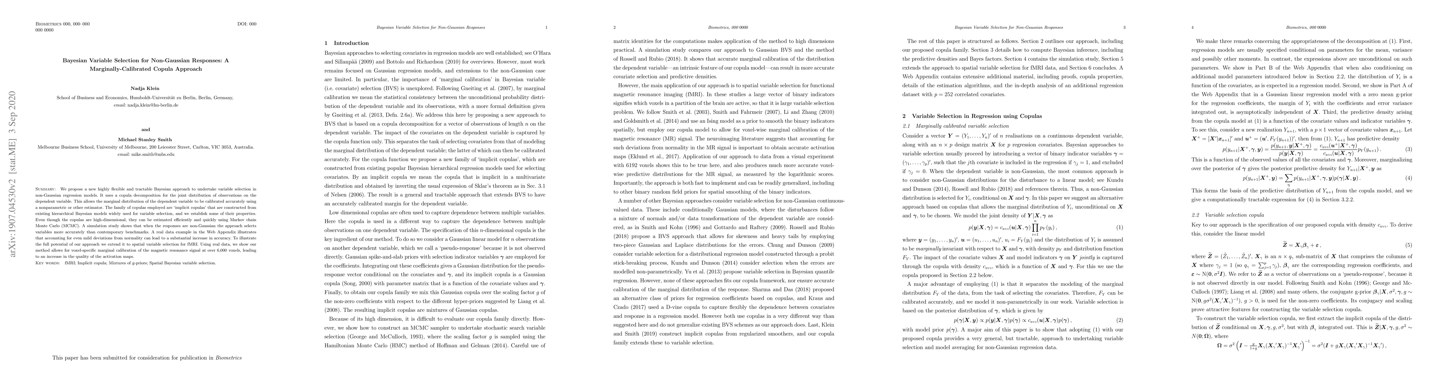 We propose a new highly flexible and tractable Bayesian approach to undertake variable selection in non-Gaussian regression models. It uses a copula decomposition for the joint distribution of observations on the dependent variable. This allows the marginal distribution of the dependent variable to be calibrated accurately using a nonparametric or other estimator. The family of copulas employed are `implicit copulas' that are constructed from existing hierarchical Bayesian models widely used for variable selection, and we establish some of their properties. Even though the copulas are high-dimensional, they can be estimated efficiently and quickly using Markov chain Monte Carlo (MCMC). A simulation study shows that when the responses are non-Gaussian the approach selects variables more accurately than contemporary benchmarks. A real data example in the Web Appendix illustrates that accounting for even mild deviations from normality can lead to a substantial increase in accuracy. To illustrate the full potential of our approach we extend it to spatial variable selection for fMRI. Using real data, we show our method allows for voxel-specific marginal calibration of the magnetic resonance signal at over 6,000 voxels, leading to an increase in the quality of the activation maps.