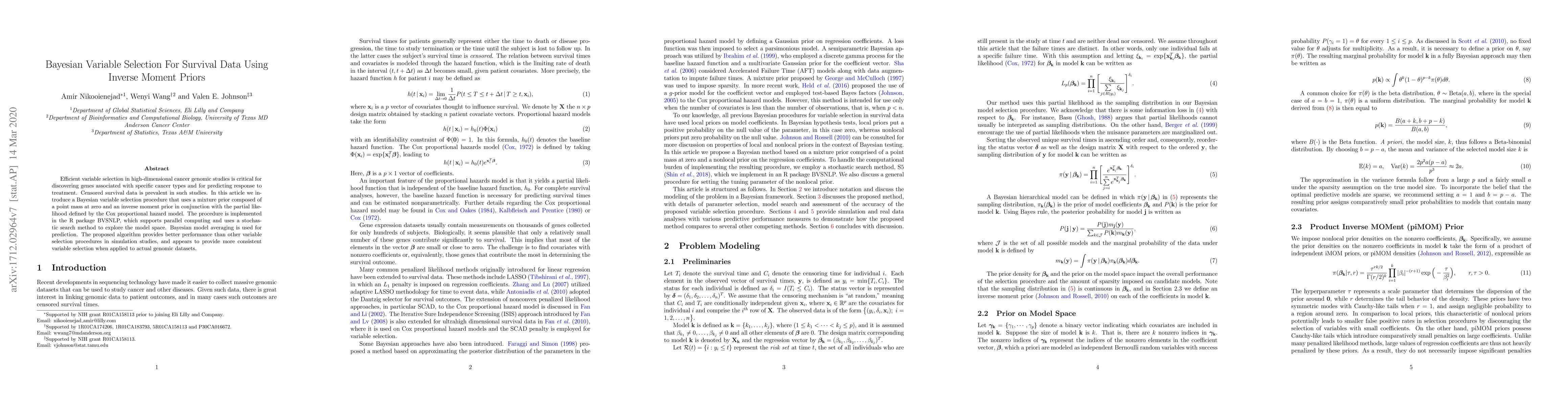 This paper proposes a Bayesian variable selection method for high-dimensional cancer genomic studies using a mixture prior with inverse moment priors and the Cox proportional hazards model. The R package BVSNLP implements this method, showing superior performance in simulation studies and consistent variable selection in real genomic datasets.
