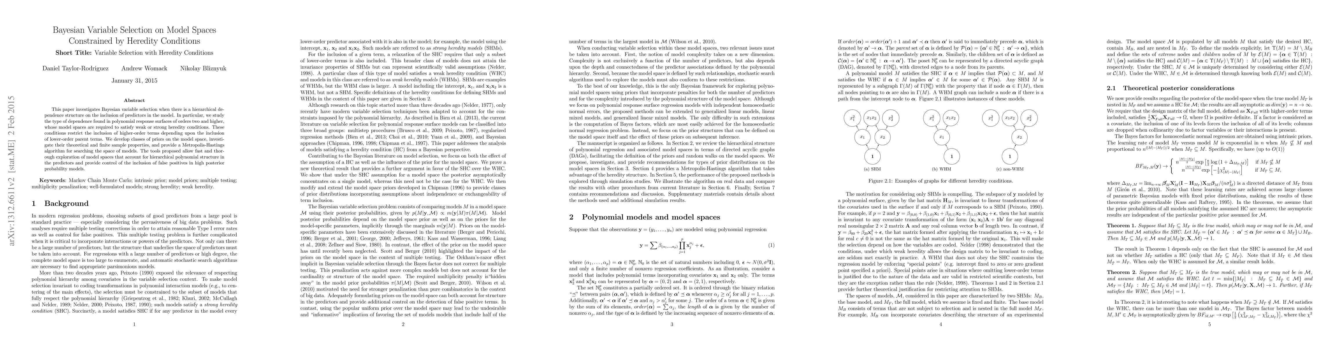 This paper investigates Bayesian variable selection when there is a hierarchical dependence structure on the inclusion of predictors in the model. In particular, we study the type of dependence found in polynomial response surfaces of orders two and higher, whose model spaces are required to satisfy weak or strong heredity conditions. These conditions restrict the inclusion of higher-order terms depending upon the inclusion of lower-order parent terms. We develop classes of priors on the model space, investigate their theoretical and finite sample properties, and provide a Metropolis-Hastings algorithm for searching the space of models. The tools proposed allow fast and thorough exploration of model spaces that account for hierarchical polynomial structure in the predictors and provide control of the inclusion of false positives in high posterior probability models.