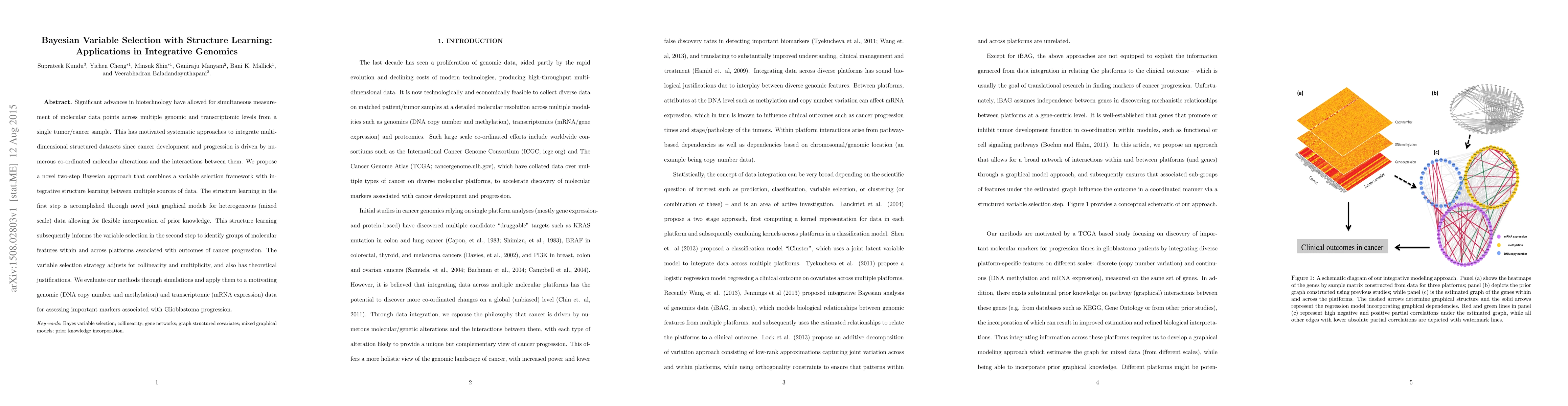 Significant advances in biotechnology have allowed for simultaneous measurement of molecular data points across multiple genomic and transcriptomic levels from a single tumor/cancer sample. This has motivated systematic approaches to integrate multi-dimensional structured datasets since cancer development and progression is driven by numerous co-ordinated molecular alterations and the interactions between them. We propose a novel two-step Bayesian approach that combines a variable selection framework with integrative structure learning between multiple sources of data. The structure learning in the first step is accomplished through novel joint graphical models for heterogeneous (mixed scale) data allowing for flexible incorporation of prior knowledge. This structure learning subsequently informs the variable selection in the second step to identify groups of molecular features within and across platforms associated with outcomes of cancer progression. The variable selection strategy adjusts for collinearity and multiplicity, and also has theoretical justifications. We evaluate our methods through simulations and apply them to a motivating genomic (DNA copy number and methylation) and transcriptomic (mRNA expression) data for assessing important markers associated with Glioblastoma progression.