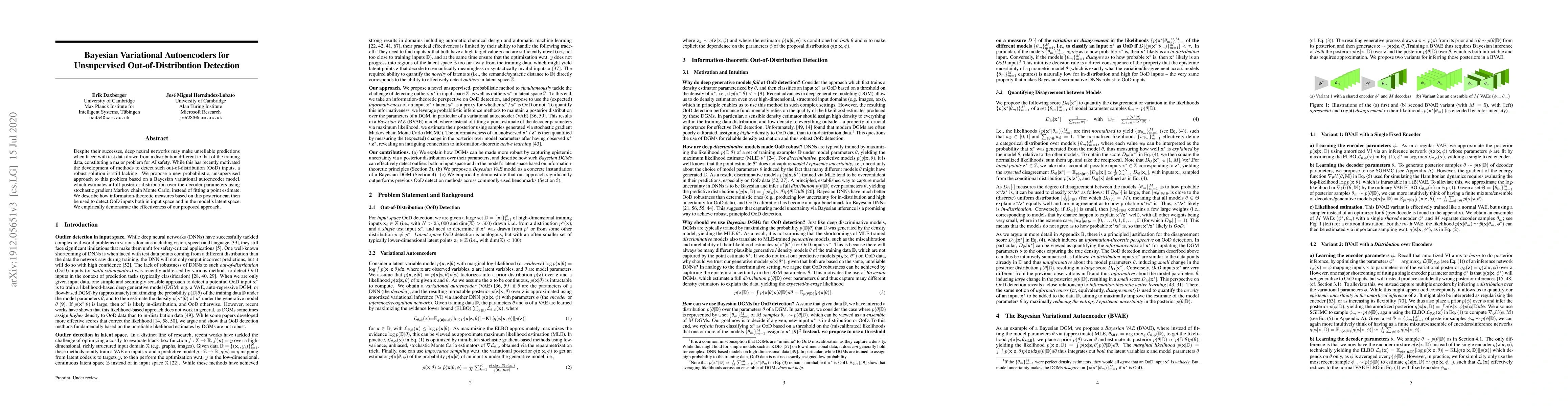 This paper proposes a Bayesian variational autoencoder for unsupervised out-of-distribution detection, addressing the issue of unreliable predictions in deep neural networks when encountering data from different distributions. The method estimates a full posterior distribution over decoder parameters to identify out-of-distribution inputs effectively.