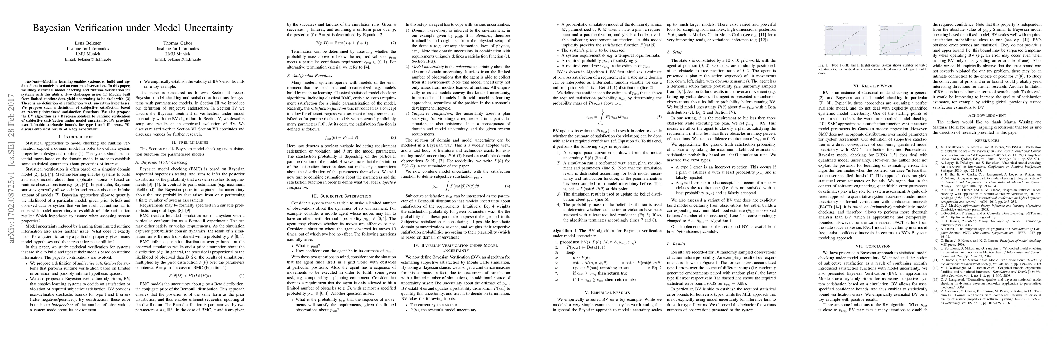 Machine learning enables systems to build and update domain models based on runtime observations. In this paper, we study statistical model checking and runtime verification for systems with this ability. Two challenges arise: (1) Models built from limited runtime data yield uncertainty to be dealt with. (2) There is no definition of satisfaction w.r.t. uncertain hypotheses. We propose such a definition of subjective satisfaction based on recently introduced satisfaction functions. We also propose the BV algorithm as a Bayesian solution to runtime verification of subjective satisfaction under model uncertainty. BV provides user-definable stochastic bounds for type I and II errors. We discuss empirical results from an example application to illustrate our ideas.