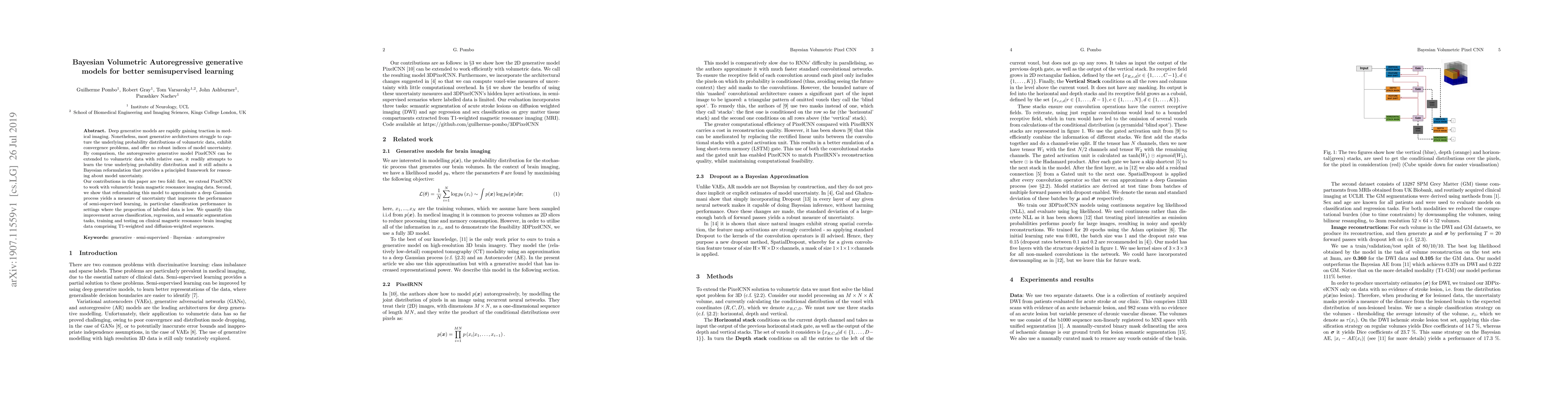 Deep generative models are rapidly gaining traction in medical imaging. Nonetheless, most generative architectures struggle to capture the underlying probability distributions of volumetric data, exhibit convergence problems, and offer no robust indices of model uncertainty. By comparison, the autoregressive generative model PixelCNN can be extended to volumetric data with relative ease, it readily attempts to learn the true underlying probability distribution and it still admits a Bayesian reformulation that provides a principled framework for reasoning about model uncertainty. Our contributions in this paper are two fold: first, we extend PixelCNN to work with volumetric brain magnetic resonance imaging data. Second, we show that reformulating this model to approximate a deep Gaussian process yields a measure of uncertainty that improves the performance of semi-supervised learning, in particular classification performance in settings where the proportion of labelled data is low. We quantify this improvement across classification, regression, and semantic segmentation tasks, training and testing on clinical magnetic resonance brain imaging data comprising T1-weighted and diffusion-weighted sequences.