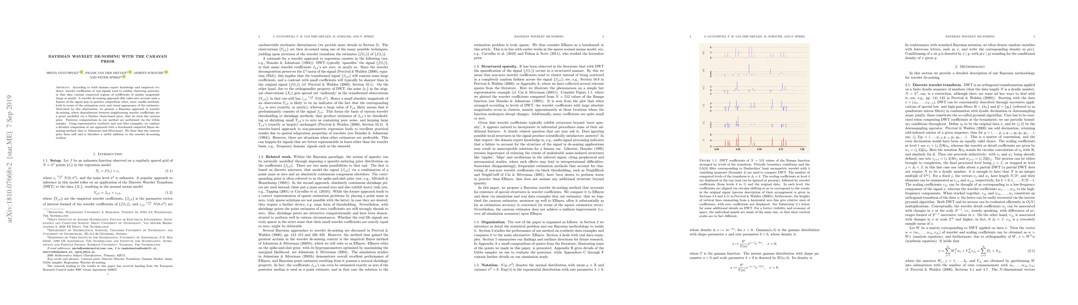 This paper proposes a Bayesian wavelet de-noising method using the caravan prior to model dependencies between neighboring wavelet coefficients, achieving better performance compared to a benchmark empirical Bayes method. The method employs the Gibbs sampler for posterior computations and demonstrates superior results on both synthetic and real data.