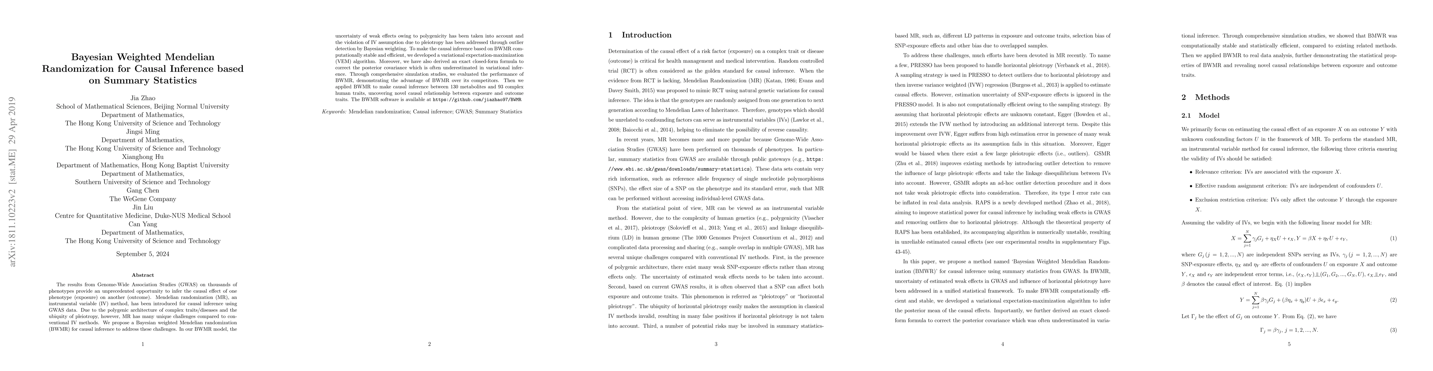 This paper proposes Bayesian weighted Mendelian randomization (BWMR) for causal inference using GWAS summary data, addressing challenges of polygenicity and pleiotropy. The BWMR model incorporates Bayesian weighting to detect outliers and corrects posterior covariance, employing a VEM algorithm for computational efficiency. Simulation studies and applications to metabolites and human traits demonstrate BWMR's effectiveness.