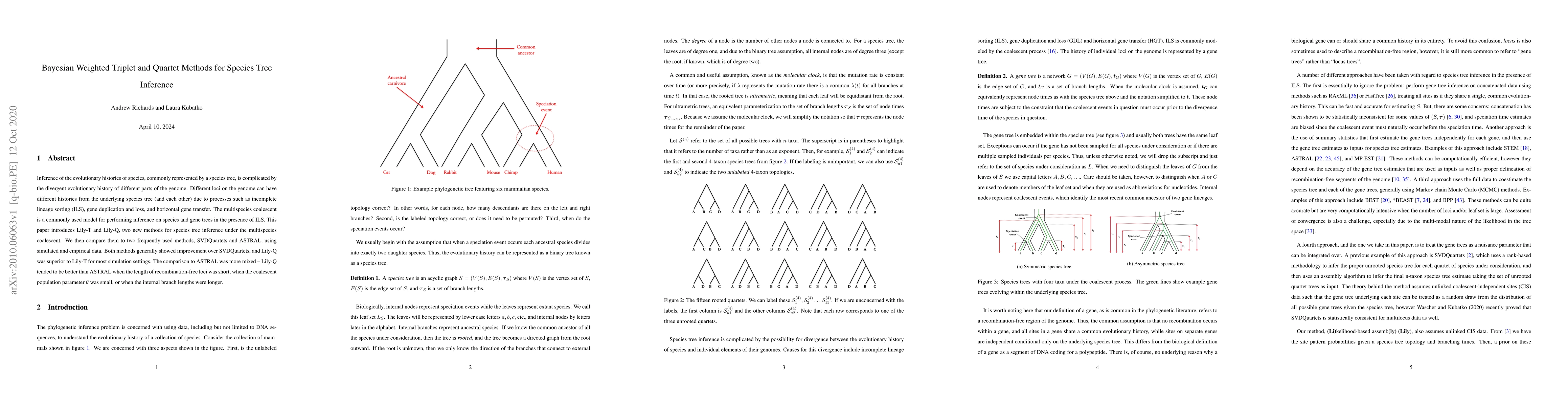 This paper introduces Lily-T and Lily-Q, novel Bayesian methods for species tree inference under the multispecies coalescent, showing improved performance over SVDQuartets and mixed results compared to ASTRAL, especially under specific genomic conditions.