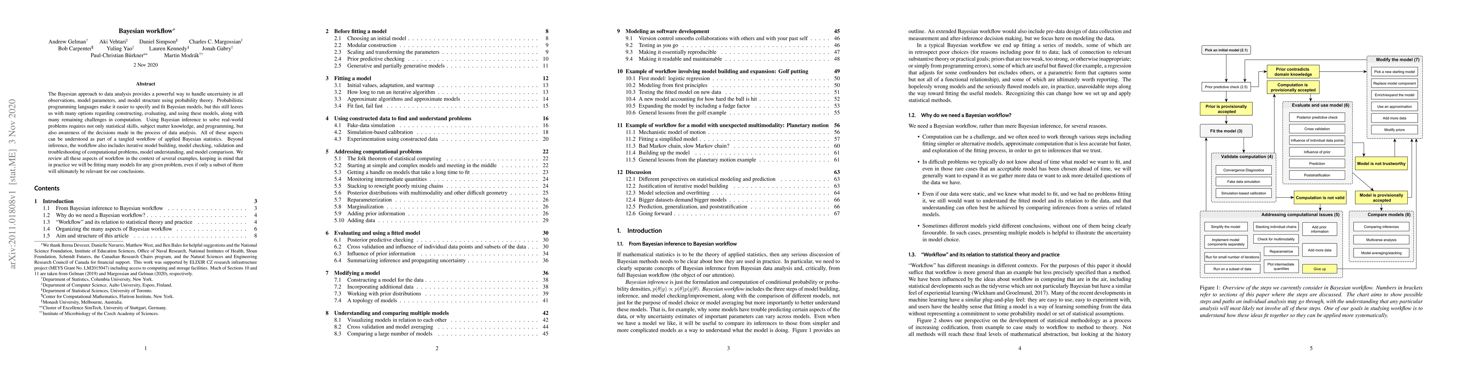 The Bayesian workflow encompasses the entire process of data analysis, from model specification to inference, requiring statistical, computational, and subject matter expertise. This workflow includes iterative model building, validation, and comparison, highlighting the complexity and multifaceted nature of applied Bayesian statistics.