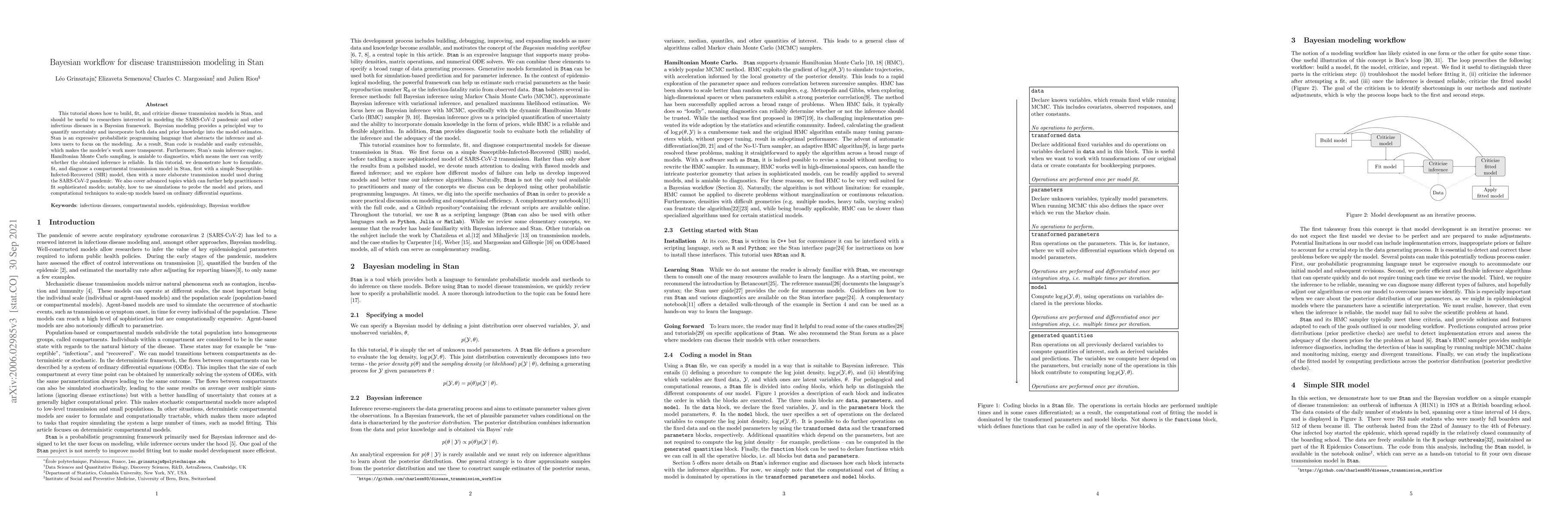 This paper provides a tutorial on constructing, fitting, and evaluating Bayesian disease transmission models using Stan, focusing on the SARS-CoV-2 pandemic and other infectious diseases. It highlights the benefits of Bayesian modeling, the readability of Stan code, and the use of Hamiltonian Monte Carlo sampling for reliable inference.