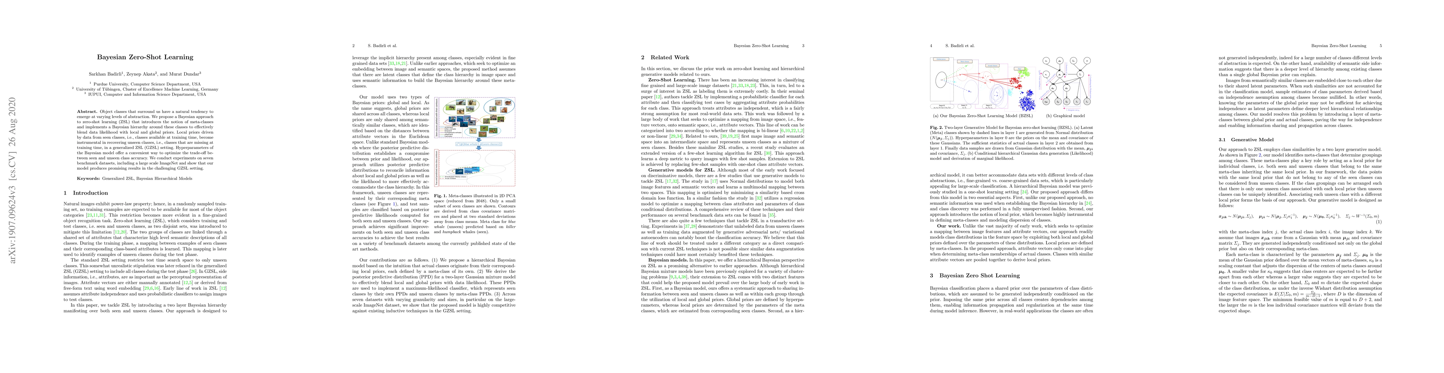 Object classes that surround us have a natural tendency to emerge at varying levels of abstraction. We propose a Bayesian approach to zero-shot learning (ZSL) that introduces the notion of meta-classes and implements a Bayesian hierarchy around these classes to effectively blend data likelihood with local and global priors. Local priors driven by data from seen classes, i.e. classes that are available at training time, become instrumental in recovering unseen classes, i.e. classes that are missing at training time, in a generalized ZSL setting. Hyperparameters of the Bayesian model offer a convenient way to optimize the trade-off between seen and unseen class accuracy in addition to guiding other aspects of model fitting. We conduct experiments on seven benchmark datasets including the large scale ImageNet and show that our model improves the current state of the art in the challenging generalized ZSL setting.