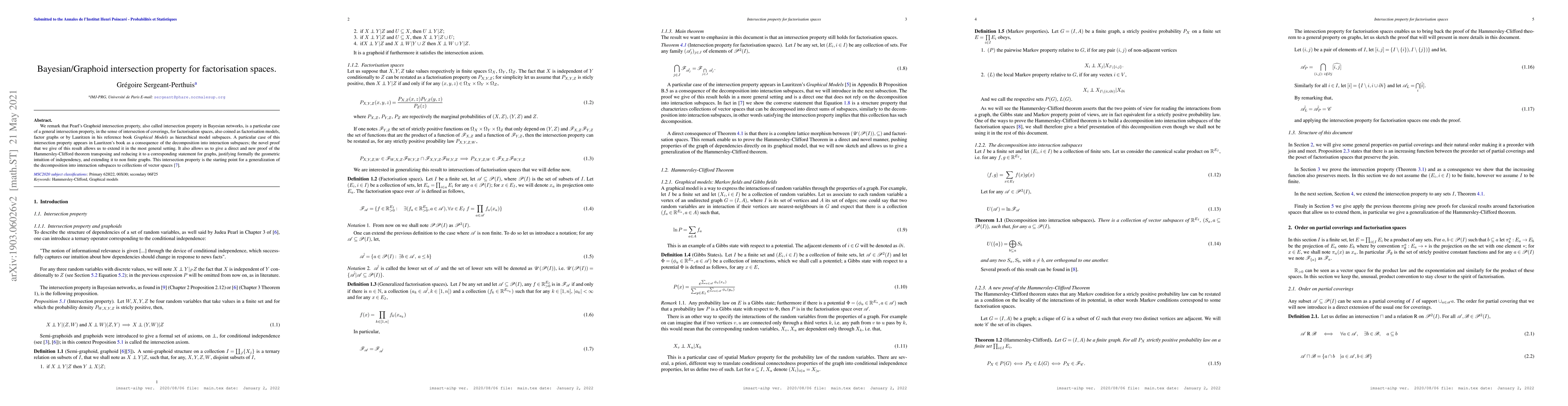 We remark that Pearl's Graphoid intersection property, also called intersection property in Bayesian networks, is a particular case of a general intersection property, in the sense of intersection of coverings, for factorisation spaces, also coined as factorisation models, factor graphs or by Lauritzen in his reference book 'Graphical Models' as hierarchical model subspaces. A particular case of this intersection property appears in Lauritzen's book as a consequence of the decomposition into interaction subspaces; the novel proof that we give of this result allows us to extend it in the most general setting. It also allows us to give a direct and new proof of the Hammersley-Clifford theorem transposing and reducing it to a corresponding statement for graphs, justifying formally the geometric intuition of independency, and extending it to non finite graphs. This intersection property is the starting point for a generalization of the decomposition into interaction subspaces to collections of vector spaces.