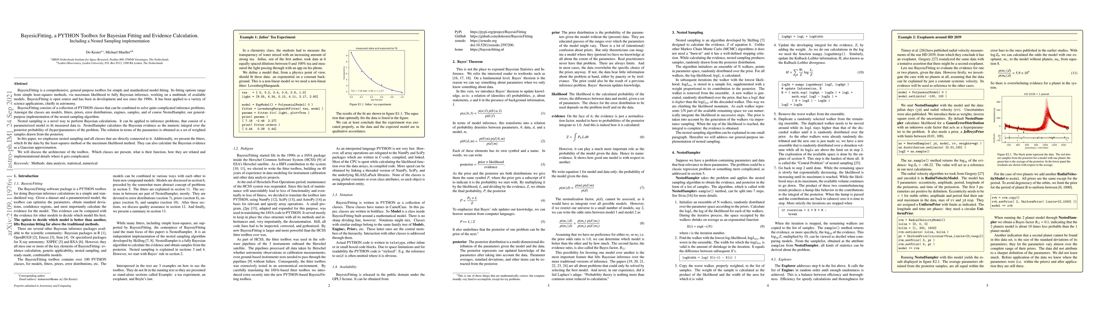 BayesicFitting is a Python toolbox for Bayesian inference and evidence calculation, offering various fitting methods including least-squares and maximum likelihood. It features nested sampling for Bayesian calculations and is open-source, widely used in astronomy.