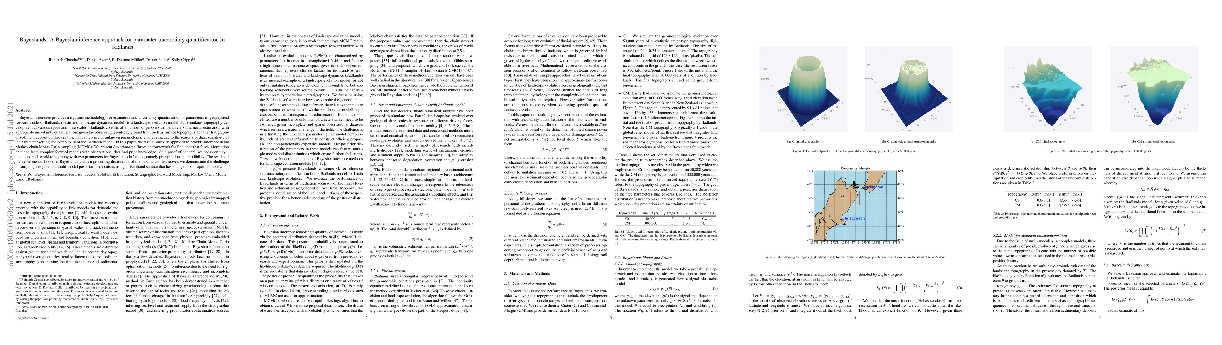 This paper introduces Bayeslands, a Bayesian inference framework using MCMC to estimate and quantify uncertainties in Badlands model parameters, focusing on precipitation and erodibility. The approach effectively integrates observational data and prior knowledge, demonstrating promising results despite challenges in sampling complex posterior distributions.