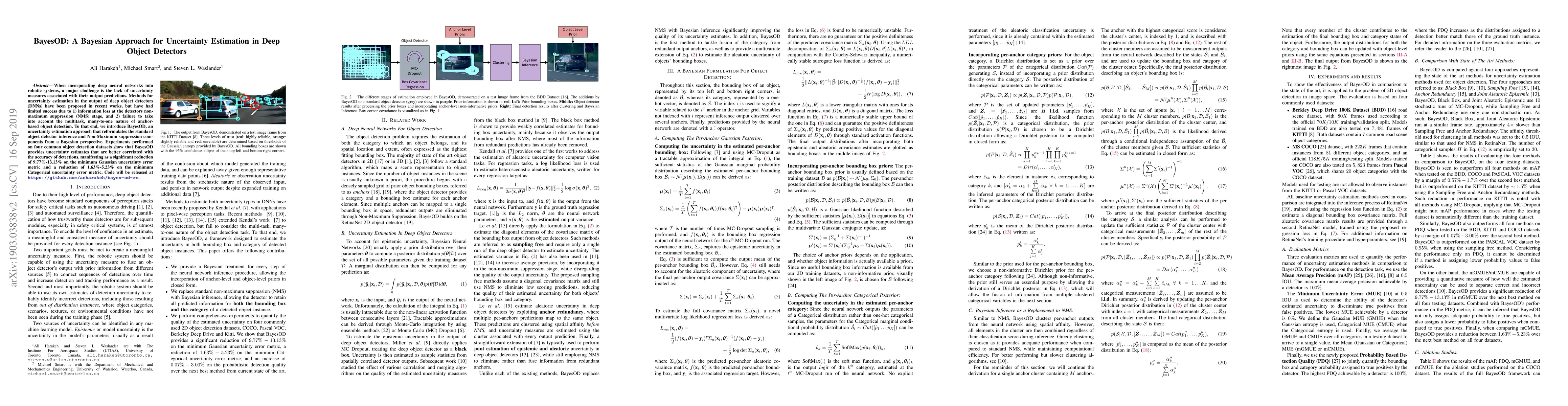 BayesOD introduces a Bayesian approach to uncertainty estimation in deep object detectors, addressing information loss and multitask nature issues. Experiments demonstrate significant reductions in uncertainty error metrics, improving the correlation between uncertainty estimates and detection accuracy.