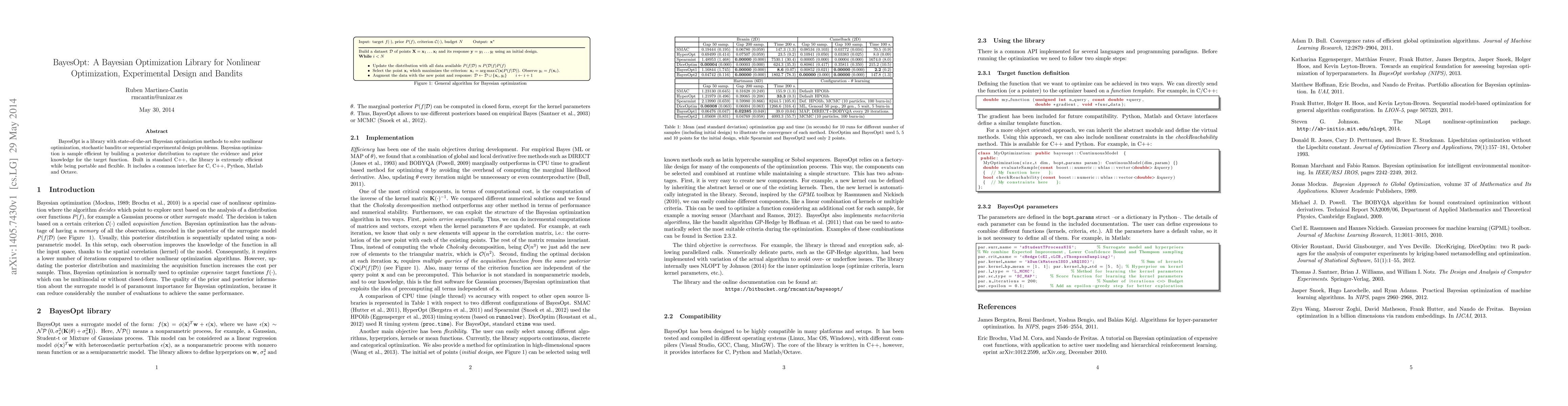 BayesOpt is a library with state-of-the-art Bayesian optimization methods to solve nonlinear optimization, stochastic bandits or sequential experimental design problems. Bayesian optimization is sample efficient by building a posterior distribution to capture the evidence and prior knowledge for the target function. Built in standard C++, the library is extremely efficient while being portable and flexible. It includes a common interface for C, C++, Python, Matlab and Octave.