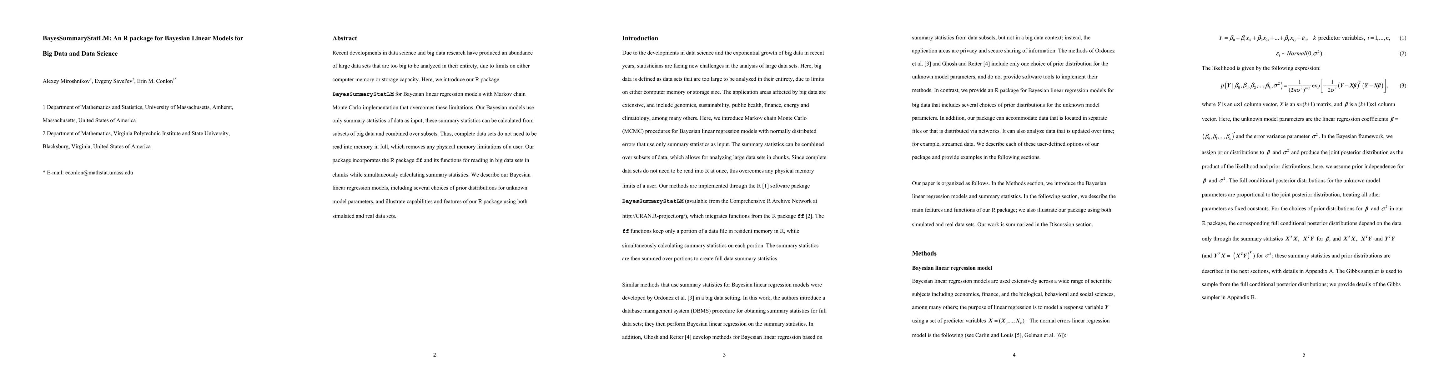 The R package 'BayesSummaryStatLM' enables Bayesian linear regression analysis of big data by using only summary statistics, circumventing memory and storage limitations. It integrates with 'ff' to read data in chunks, demonstrating flexibility with both simulated and real datasets.