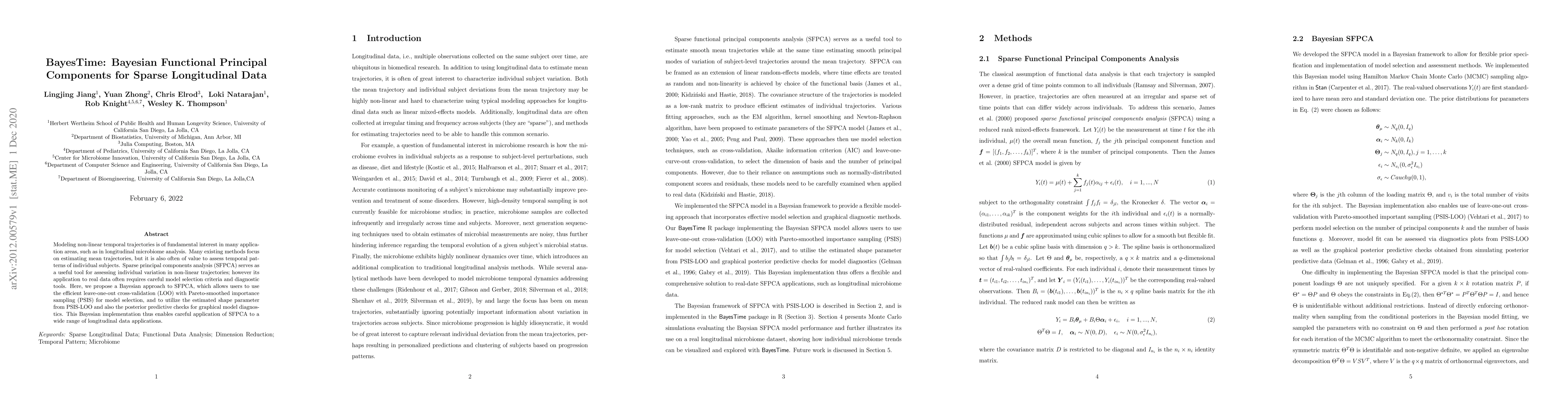 This paper proposes a Bayesian functional principal components analysis (BayesTime) for sparse longitudinal data, enhancing the assessment of individual temporal patterns. It utilizes leave-one-out cross-validation with Pareto-smoothed importance sampling for model selection and diagnostics, improving the application of sparse PCA in longitudinal studies like microbiome analysis.