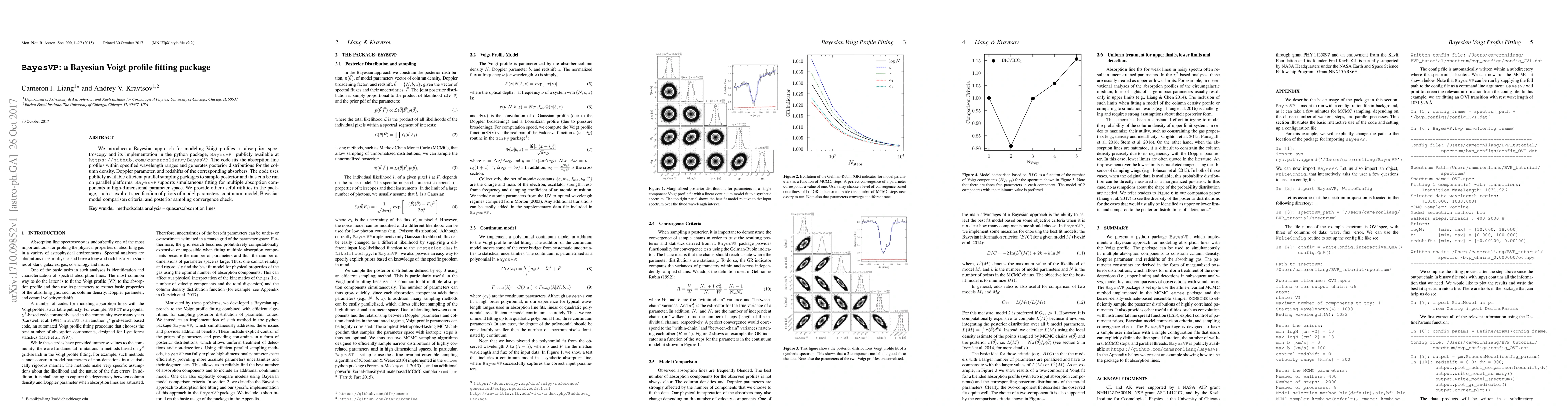 BayesVP is a Bayesian Voigt profile fitting package for absorption spectroscopy, implemented in Python and available on GitHub. It fits absorption line profiles, generating posterior distributions for column density, Doppler parameter, and redshifts, and supports parallel sampling and simultaneous fitting of multiple components.