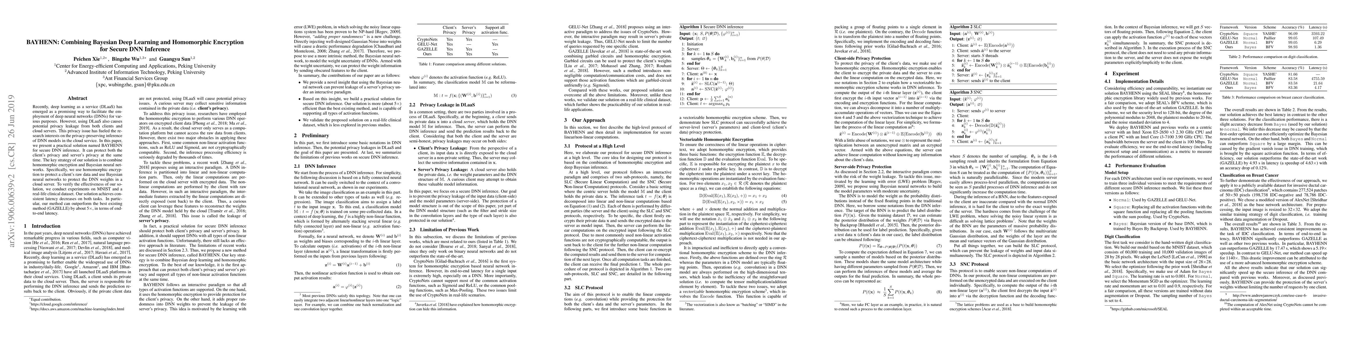 BAYHENN integrates Bayesian deep learning and homomorphic encryption to secure DNN inference in cloud services, protecting both client data and server model weights. Experiments demonstrate significant latency improvements over existing methods.