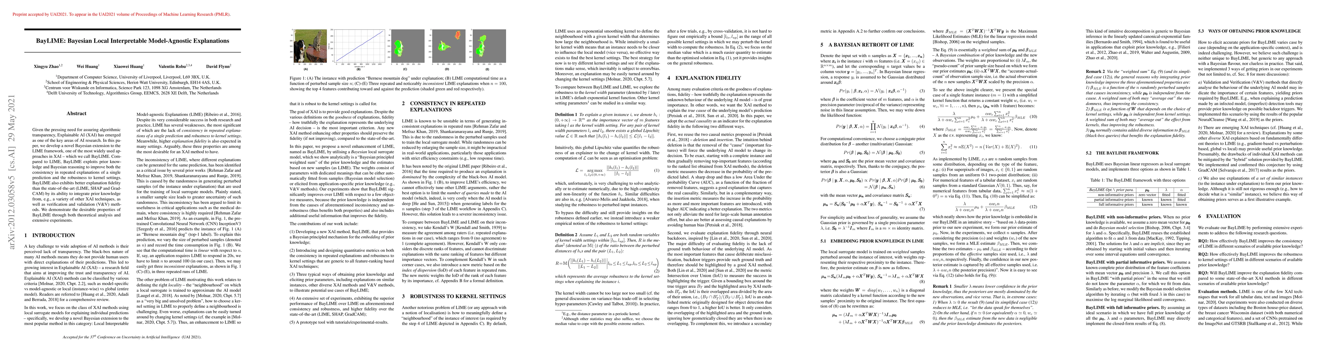 Given the pressing need for assuring algorithmic transparency, Explainable AI (XAI) has emerged as one of the key areas of AI research. In this paper, we develop a novel Bayesian extension to the LIME framework, one of the most widely used approaches in XAI -- which we call BayLIME. Compared to LIME, BayLIME exploits prior knowledge and Bayesian reasoning to improve both the consistency in repeated explanations of a single prediction and the robustness to kernel settings. BayLIME also exhibits better explanation fidelity than the state-of-the-art (LIME, SHAP and GradCAM) by its ability to integrate prior knowledge from, e.g., a variety of other XAI techniques, as well as verification and validation (V&V) methods. We demonstrate the desirable properties of BayLIME through both theoretical analysis and extensive experiments.