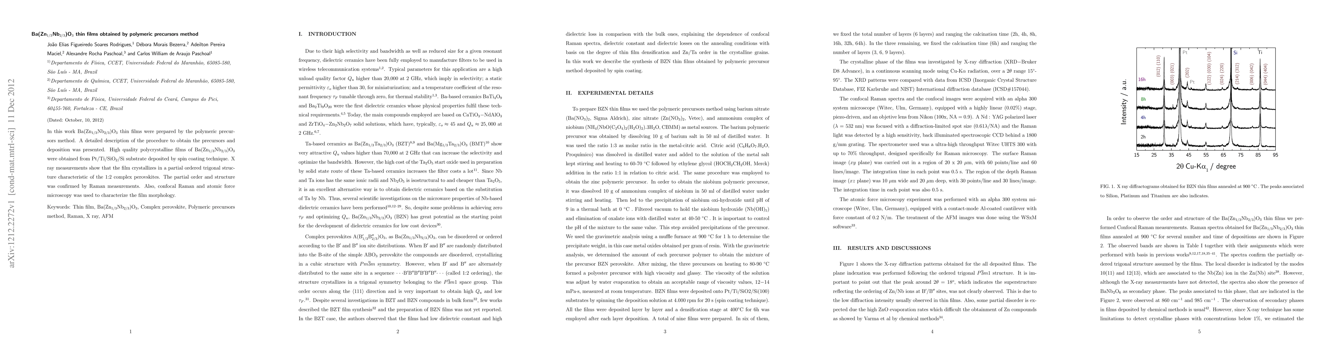 Researchers created high-quality polycrystalline thin films of Ba(Zn1/3Nb2/3)O3 using a polymeric precursors method, revealing a partial ordered trigonal structure characteristic of 1:2 complex perovskites.