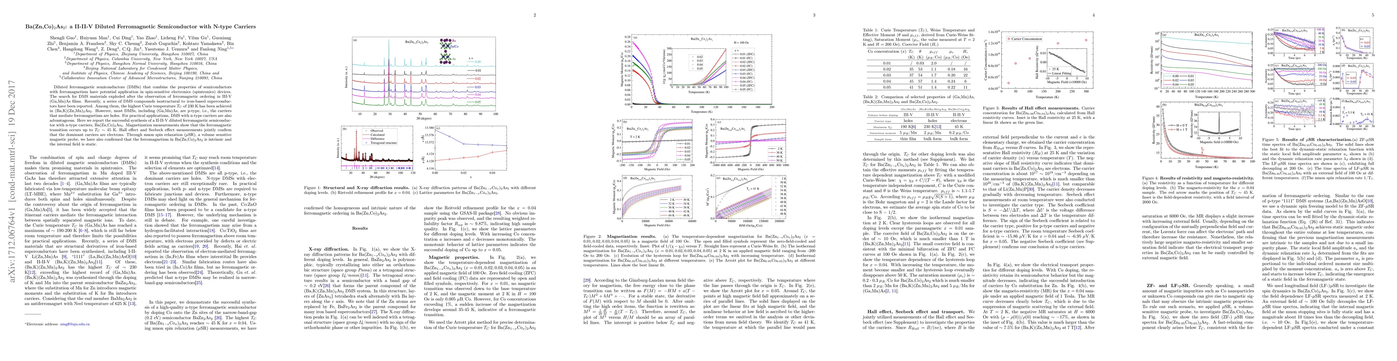 Ba(Zn,Co)₂As₂ is a newly synthesized II-II-V diluted ferromagnetic semiconductor with n-type carriers, exhibiting a Curie temperature of ~45 K. This material's intrinsic ferromagnetism and electron-dominated conduction make it a promising candidate for spintronics applications.