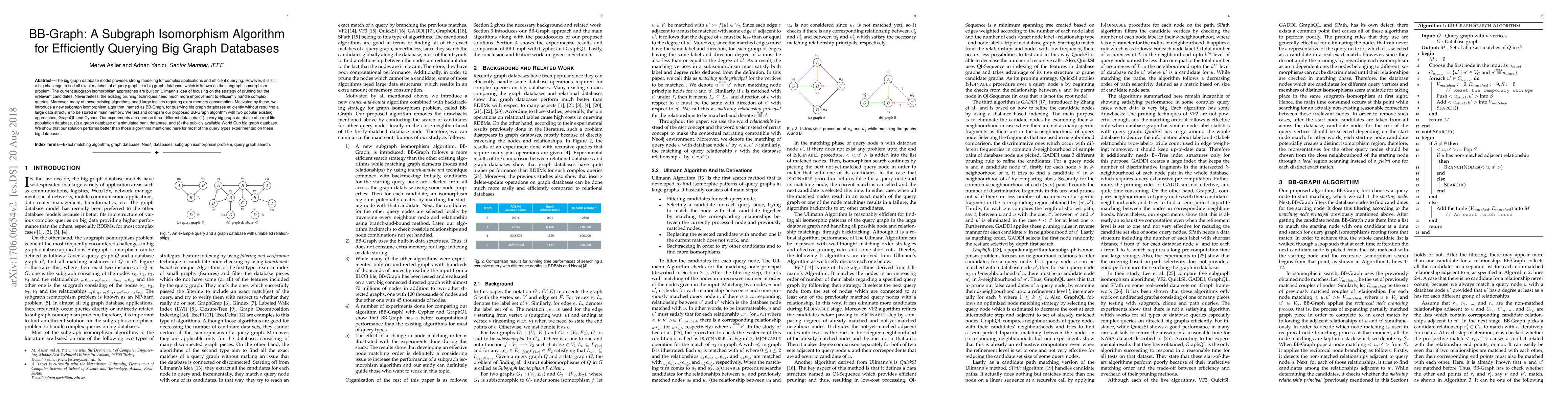 BB-Graph is a new subgraph isomorphism algorithm designed to efficiently query big graph databases without requiring large memory structures. It outperforms existing methods like GraphQL and Cypher in experiments on three diverse datasets, demonstrating superior performance for most query types.