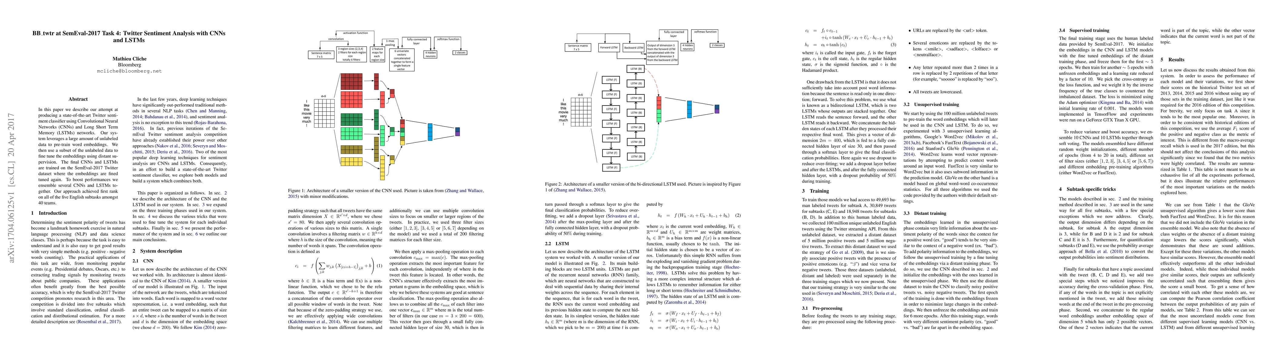This paper presents a top-performing system for Twitter sentiment analysis using CNNs and LSTMs, pre-training word embeddings on unlabeled data and fine-tuning them with distant supervision. The final model, which ensembles multiple CNNs and LSTMs, achieved first place in all five English subtasks of the SemEval-2017 competition.