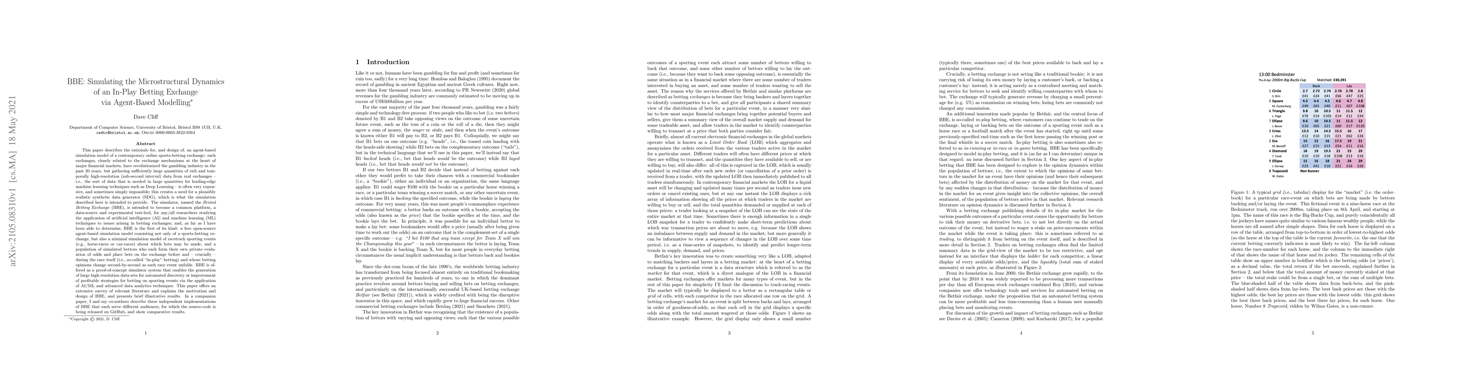 I describe the rationale for, and design of, an agent-based simulation model of a contemporary online sports-betting exchange: such exchanges, closely related to the exchange mechanisms at the heart of major financial markets, have revolutionized the gambling industry in the past 20 years, but gathering sufficiently large quantities of rich and temporally high-resolution data from real exchanges - i.e., the sort of data that is needed in large quantities for Deep Learning - is often very expensive, and sometimes simply impossible; this creates a need for a plausibly realistic synthetic data generator, which is what this simulation now provides. The simulator, named the "Bristol Betting Exchange" (BBE), is intended as a common platform, a data-source and experimental test-bed, for researchers studying the application of AI and machine learning (ML) techniques to issues arising in betting exchanges; and, as far as I have been able to determine, BBE is the first of its kind: a free open-source agent-based simulation model consisting not only of a sports-betting exchange, but also a minimal simulation model of racetrack sporting events (e.g., horse-races or car-races) about which bets may be made, and a population of simulated bettors who each form their own private evaluation of odds and place bets on the exchange before and - crucially - during the race itself (i.e., so-called "in-play" betting) and whose betting opinions change second-by-second as each race event unfolds. BBE is offered as a proof-of-concept system that enables the generation of large high-resolution data-sets for automated discovery or improvement of profitable strategies for betting on sporting events via the application of AI/ML and advanced data analytics techniques. This paper offers an extensive survey of relevant literature and explains the motivation and design of BBE, and presents brief illustrative results.