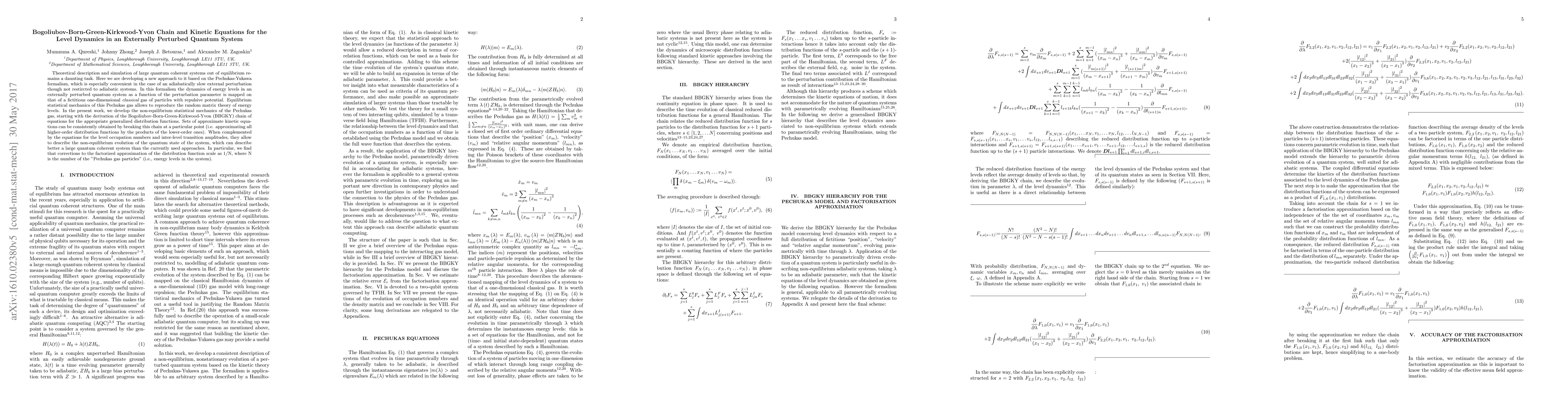 Theoretical description and simulation of large quantum coherent systems out of equilibrium remains a daunting task. Here we are developing a new approach to it based on the Pechukas-Yukawa formalism, which is especially convenient in case of an adiabatically slow external perturbation. In this formalism the dynamics of energy levels in an externally perturbed quantum system as a function of the perturbation parameter is mapped on that of a fictitious one-dimensional classical gas of particles with cubic repulsion. Equilibrium statistical mechanics of this Pechukas gas allows to reproduce the random matrix theory of energy levels. In the present work, we develop the nonequilibrium statistical mechanics of the Pechukas gas, starting with the derivation of the Bogoliubov-Born-Green-Kirkwood-Yvon (BBGKY) chain of equations for the appropriate generalized distribution functions. Sets of approximate kinetic equations can be consistently obtained by breaking this chain at a particular point (i.e. approximating all higher-order distribution functions by the products of the lower-order ones). When complemented by the equations for the level occupation numbers and inter-level transition amplitudes, they allow to describe the nonequilibrium evolution of the quantum state of the system, which can describe better a large quantum coherent system than the currently used approaches. In particular, we find that corrections to the factorized approximation of the distribution function scale as 1/N, where N is the number of the "Pechukas gas particles" (i.e. energy levels in the system).