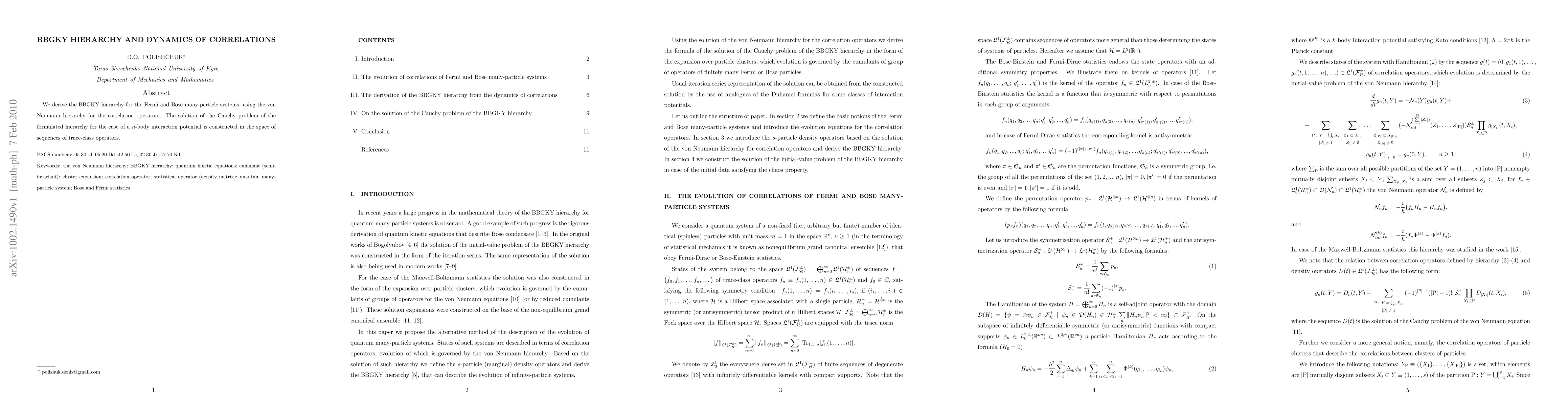 The research derives the BBGKY hierarchy for Fermi and Bose many-particle systems using the von Neumann hierarchy for correlation operators, constructing the solution in the space of sequences of trace-class operators.