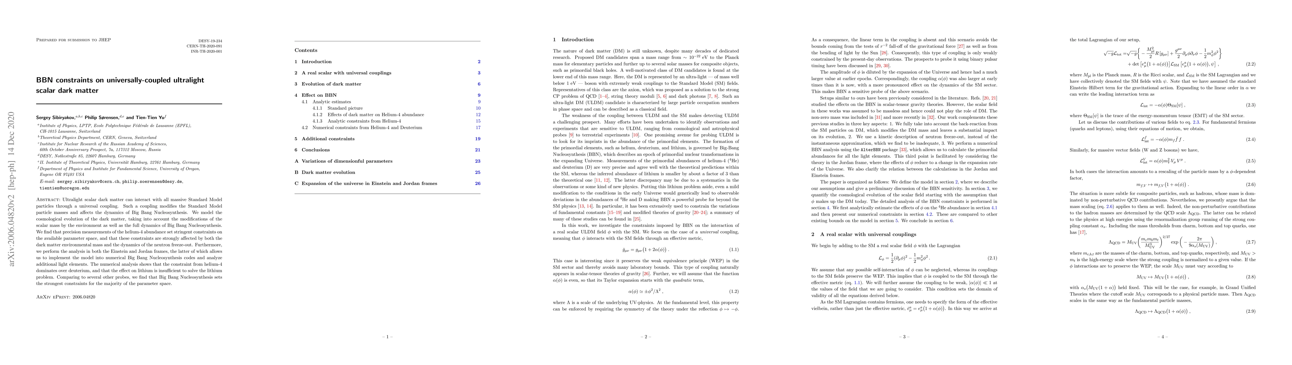 Ultralight scalar dark matter can interact with all massive Standard Model particles through a universal coupling. Such a coupling modifies the Standard Model particle masses and affects the dynamics of Big Bang Nucleosynthesis. We model the cosmological evolution of the dark matter, taking into account the modifications of the scalar mass by the environment as well as the full dynamics of Big Bang Nucleosynthesis. We find that precision measurements of the helium-4 abundance set stringent constraints on the available parameter space, and that these constraints are strongly affected by both the dark matter environmental mass and the dynamics of the neutron freeze-out. Furthermore, we perform the analysis in both the Einstein and Jordan frames, the latter of which allows us to implement the model into numerical Big Bang Nucleosynthesis codes and analyze additional light elements. The numerical analysis shows that the constraint from helium-4 dominates over deuterium, and that the effect on lithium is insufficient to solve the lithium problem. Comparing to several other probes, we find that Big Bang Nucleosynthesis sets the strongest constraints for the majority of the parameter space.