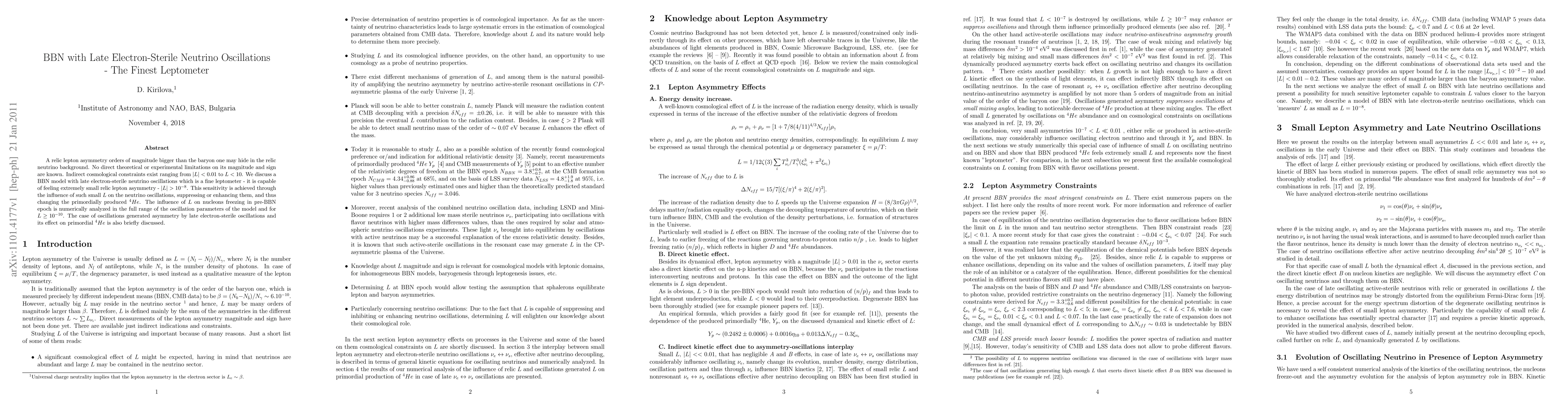 A relic lepton asymmetry orders of magnitude bigger than the baryon one may hide in the relic neutrino background. No direct theoretical or experimental limitations on its magnitude and sign are known. Indirect cosmological constraints exist ranging from $|L|<0.01$ to $L<10$. We discuss a BBN model with late electron-sterile neutrino oscillations which is a fine leptometer - it is capable of feeling extremely small relic lepton asymmetry - $|L|>10^{-8}$. This sensitivity is achieved through the influence of such small $L$ on the neutrino oscillations, suppressing or enhancing them, and thus changing the primordially produced $^4He$. The influence of $L$ on nucleons freezing in pre-BBN epoch is numerically analyzed in the full range of the oscillation parameters of the model and for $ L \ge 10^{-10}$. The case of oscillations generated asymmetry by late electron-sterile oscillations and its effect on primordial $^4He$ is also briefly discussed.