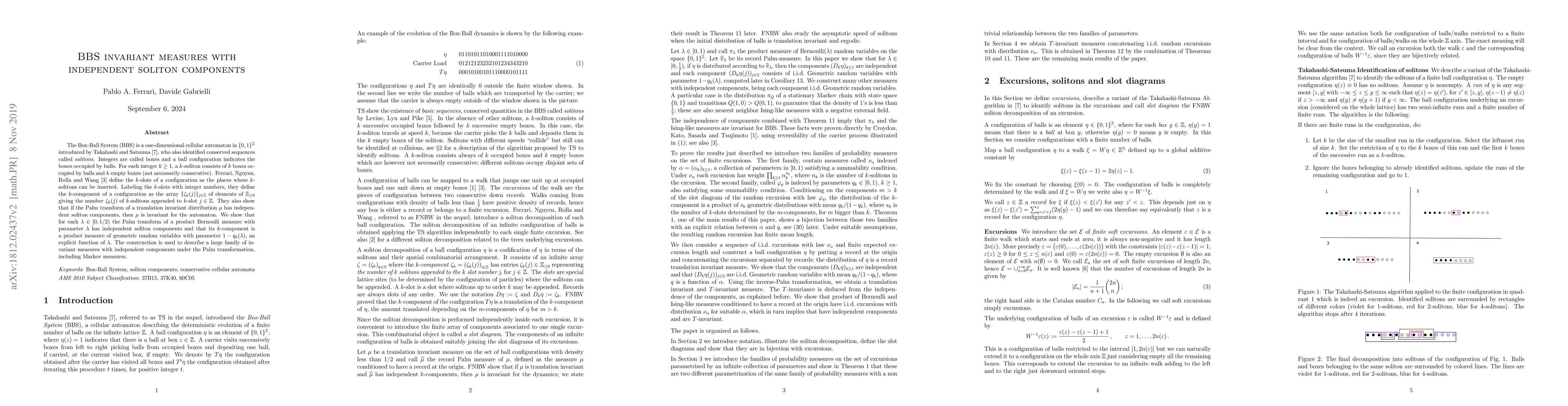 The Box-Ball System (BBS) is a one-dimensional cellular automaton in $\{0,1\}^\Z$ introduced by Takahashi and Satsuma \cite{TS}, who also identified conserved sequences called \emph{solitons}. Integers are called boxes and a ball configuration indicates the boxes occupied by balls. For each integer $k\ge1$, a $k$-soliton consists of $k$ boxes occupied by balls and $k$ empty boxes (not necessarily consecutive). Ferrari, Nguyen, Rolla and Wang \cite{FNRW} define the $k$-slots of a configuration as the places where $k$-solitons can be inserted. Labeling the $k$-slots with integer numbers, they define the $k$-component of a configuration as the array $\{\zeta_k(j)\}_{j\in \mathbb Z}$ of elements of $\Z_{\ge0}$ giving the number $\zeta_k(j)$ of $k$-solitons appended to $k$-slot $j\in \mathbb Z$. They also show that if the Palm transform of a translation invariant distribution $\mu$ has independent soliton components, then $\mu$ is invariant for the automaton. We show that for each $\lambda\in[0,1/2)$ the Palm transform of a product Bernoulli measure with parameter $\lambda$ has independent soliton components and that its $k$-component is a product measure of geometric random variables with parameter $1-q_k(\lambda)$, an explicit function of $\lambda$. The construction is used to describe a large family of invariant measures with independent components under the Palm transformation, including Markov measures.