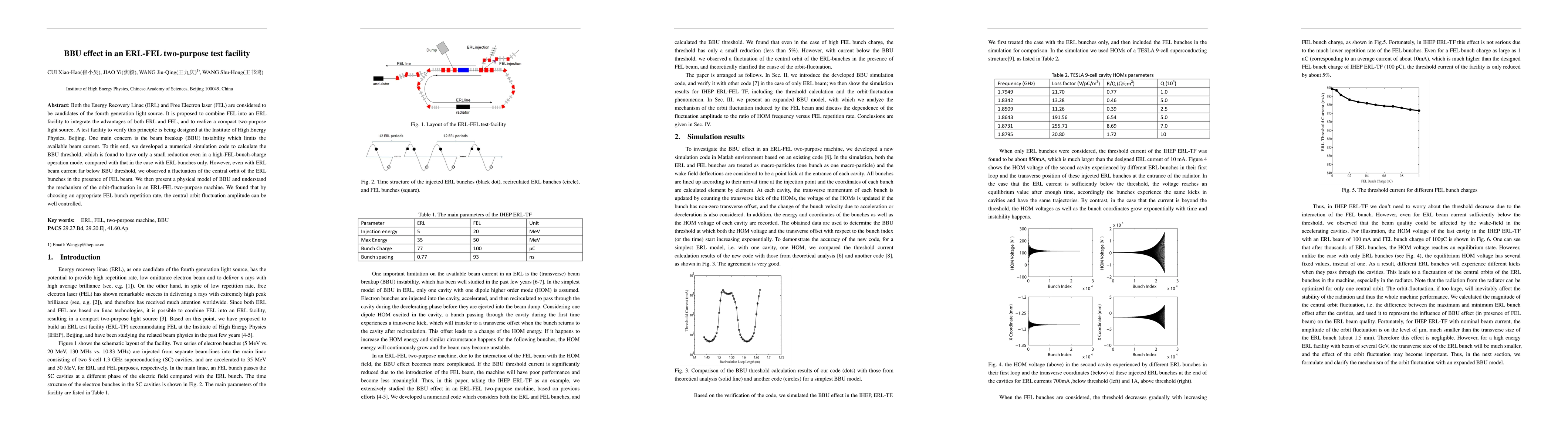 This paper investigates the beam breakup (BBU) effect in a proposed ERL-FEL two-purpose test facility, finding that the BBU threshold is only slightly reduced in high-FEL-bunch-charge operation modes. It also identifies orbit fluctuations in ERL bunches due to FEL beams, proposing a physical model and demonstrating that controlling the FEL bunch repetition rate can mitigate these fluctuations.