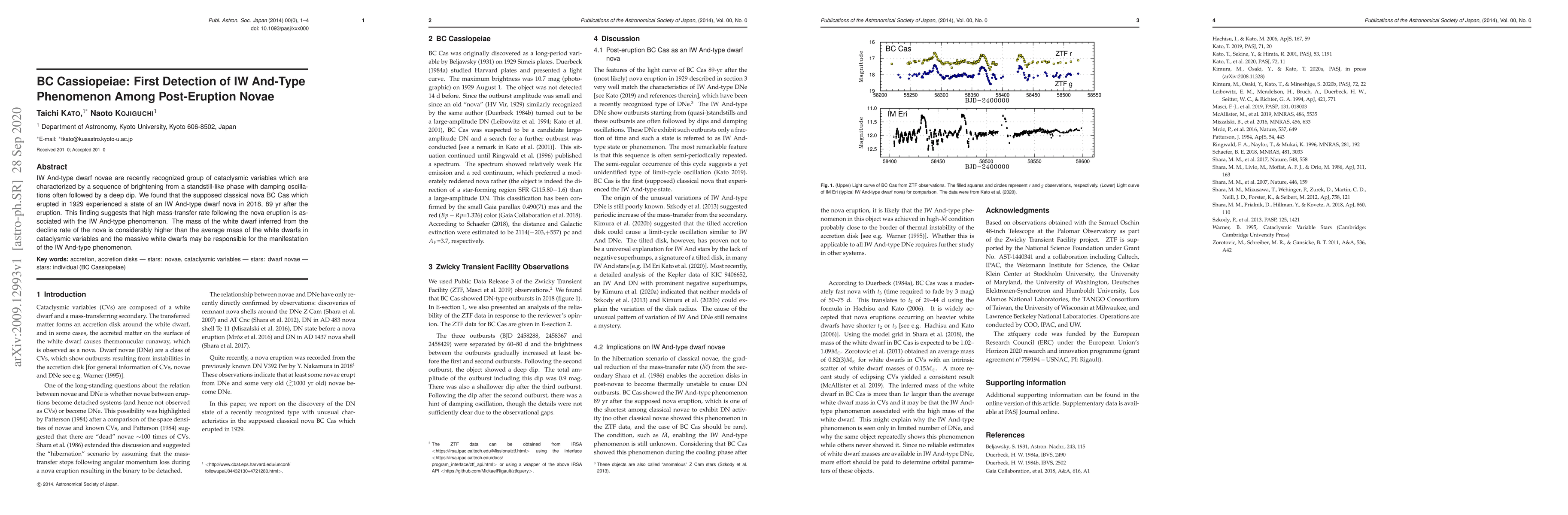 IW And-type dwarf novae are recently recognized group of cataclysmic variables which are characterized by a sequence of brightening from a standstill-like phase with damping oscillations often followed by a deep dip. We found that the supposed classical nova BC Cas which erupted in 1929 experienced a state of an IW And-type dwarf nova in 2018, 89 yr after the eruption. This finding suggests that high mass-transfer rate following the nova eruption is associated with the IW And-type phenomenon. The mass of the white dwarf inferred from the decline rate of the nova is considerably higher than the average mass of the white dwarfs in cataclysmic variables and the massive white dwarfs may be responsible for the manifestation of the IW And-type phenomenon.