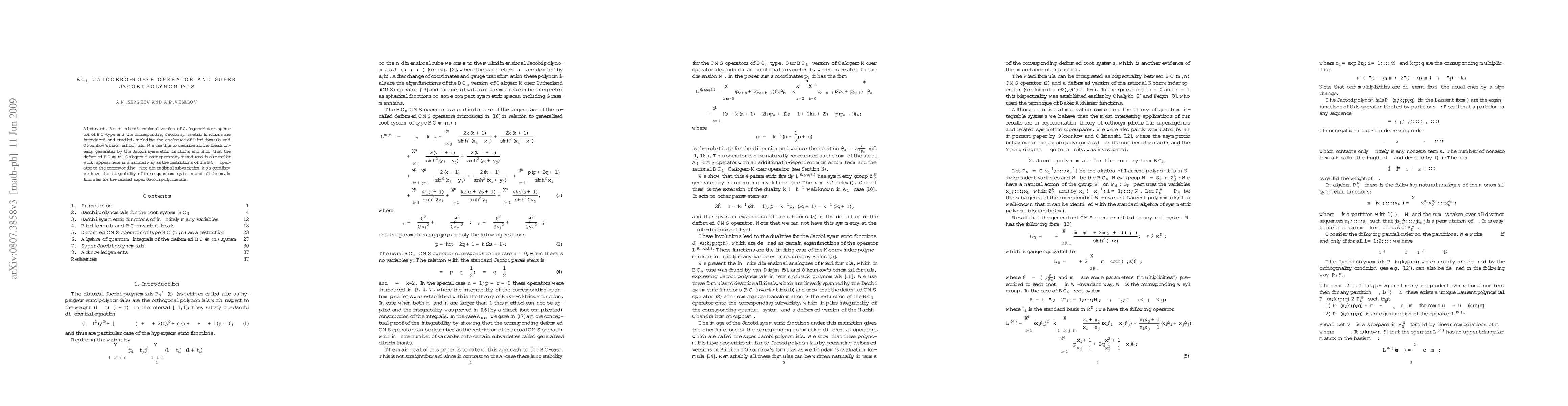 This paper introduces an infinite-dimensional version of the Calogero-Moser operator and its relation to super Jacobi polynomials, showing integrability of quantum systems and generalizing known formulas.