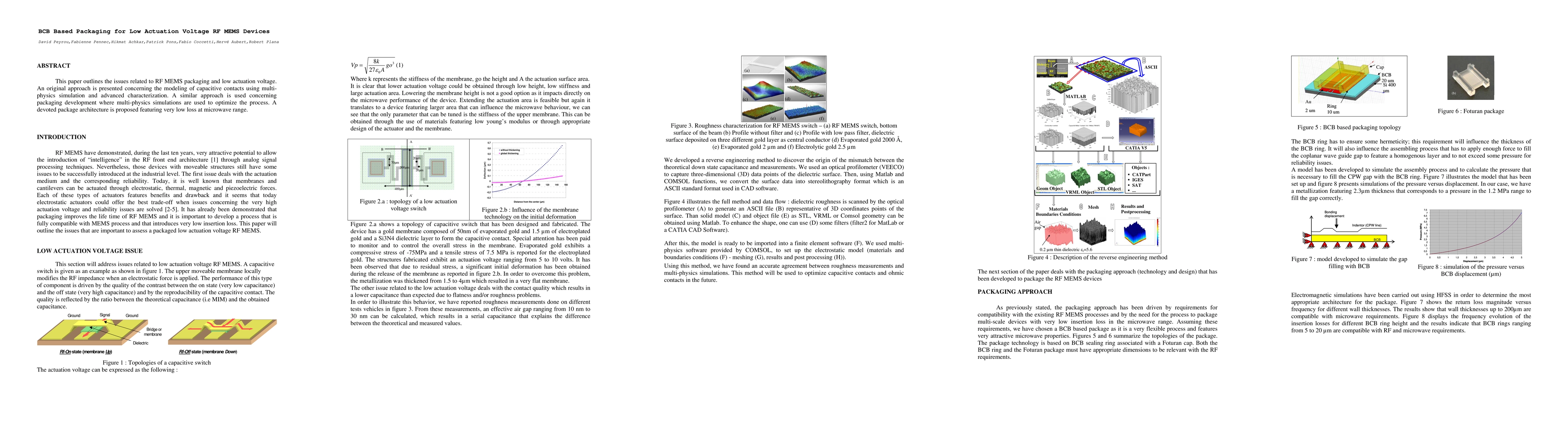 The paper presents a novel capacitive switch design, a reverse engineering method for optimizing contact quality, and a BCB-based packaging solution for low actuation voltage RF MEMS devices with low insertion loss in the microwave range.