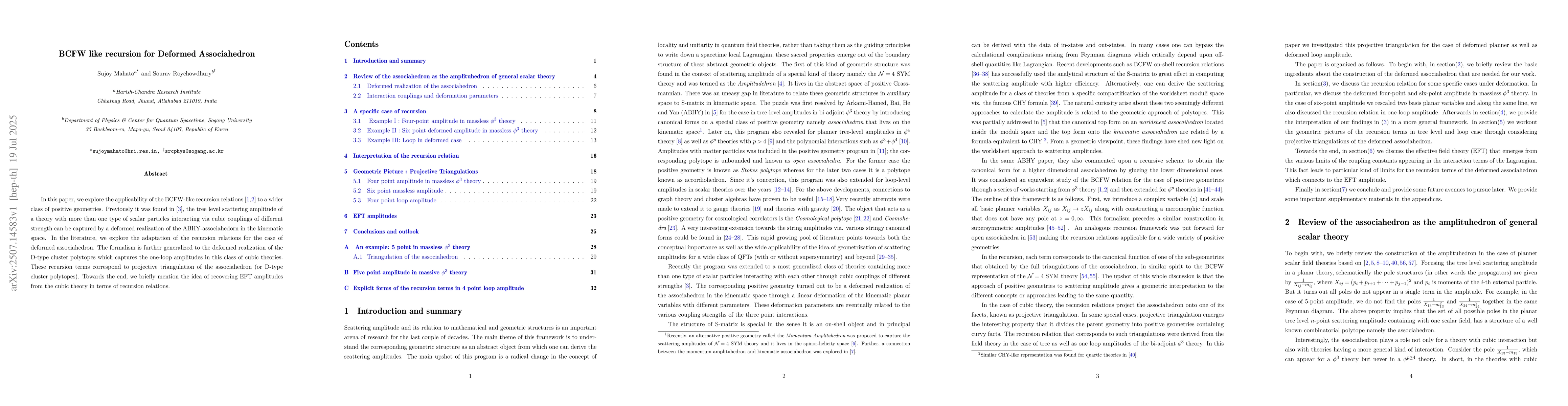 In this paper, we explore the applicability of the BCFW-like recursion relations \cite{He:2018svj,Yang:2019esm} to a wider class of positive geometries. Previously it was found in \cite{Jagadale:2022rbl}, the tree level scattering amplitude of a theory with more than one type of scalar particles interacting via cubic couplings of different strength can be captured by a deformed realization of the ABHY-associahedorn in the kinematic space. In the literature, we explore the adaptation of the recursion relations for the case of deformed associahedron. The formalism is further generalized to the deformed realization of the D-type cluster polytopes which captures the one-loop amplitudes in this class of cubic theories. These recursion terms correspond to projective triangulation of the associahedron (or D-type cluster polytopes). Towards the end, we briefly mention the idea of recovering EFT amplitudes from the cubic theory in terms of recursion relations.