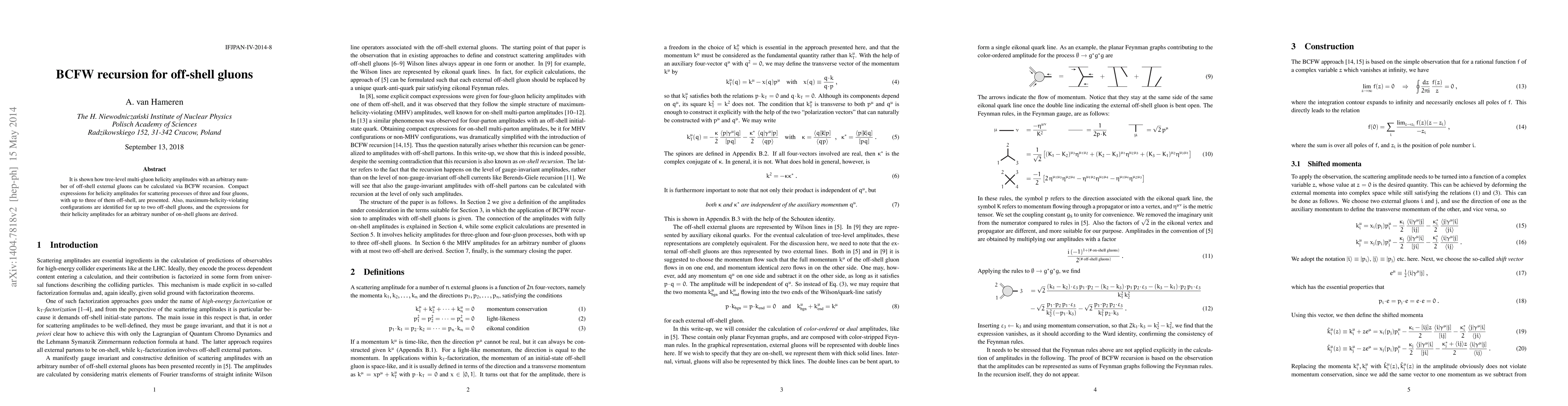 The paper demonstrates BCFW recursion's application to compute tree-level multi-gluon helicity amplitudes with off-shell gluons, presenting compact expressions for three and four gluon processes. It also identifies maximum-helicity-violating configurations for up to two off-shell gluons and derives their helicity amplitudes for any number of on-shell gluons.