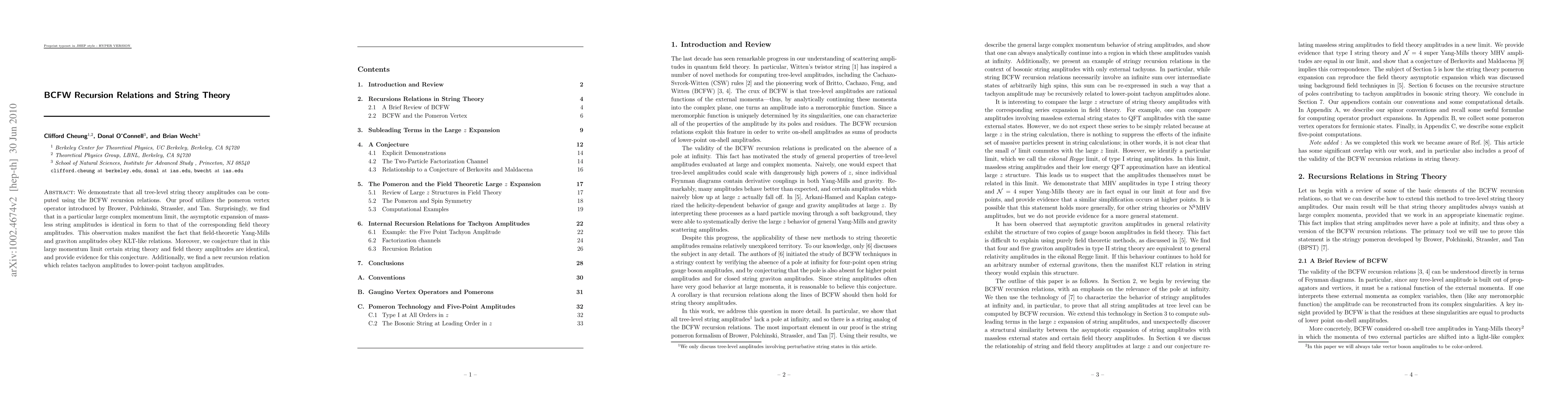 We demonstrate that all tree-level string theory amplitudes can be computed using the BCFW recursion relations. Our proof utilizes the pomeron vertex operator introduced by Brower, Polchinski, Strassler, and Tan. Surprisingly, we find that in a particular large complex momentum limit, the asymptotic expansion of massless string amplitudes is identical in form to that of the corresponding field theory amplitudes. This observation makes manifest the fact that field-theoretic Yang-Mills and graviton amplitudes obey KLT-like relations. Moreover, we conjecture that in this large momentum limit certain string theory and field theory amplitudes are identical, and provide evidence for this conjecture. Additionally, we find a new recursion relation which relates tachyon amplitudes to lower-point tachyon amplitudes.