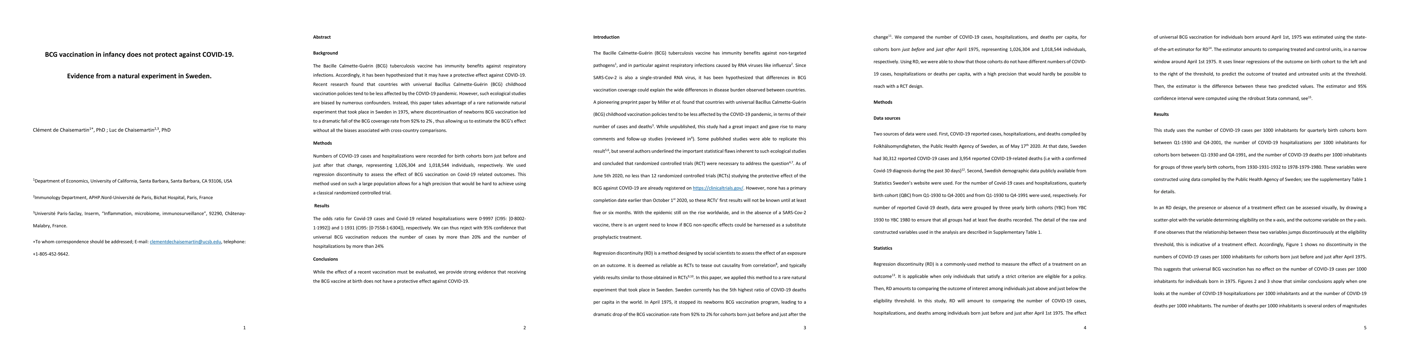 This study, using a natural experiment in Sweden, found no protective effect of BCG vaccination against COVID-19. Despite initial hypotheses and ecological studies, regression discontinuity analysis on 2 million individuals showed no significant reduction in COVID-19 cases or hospitalizations due to BCG vaccination.