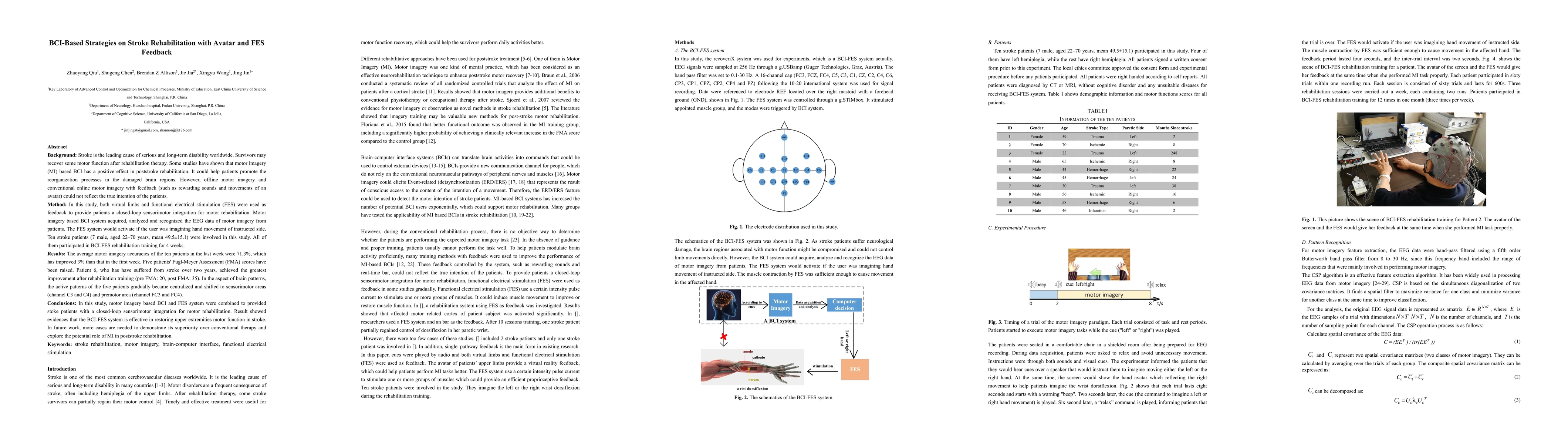 This study combines brain-computer interface (BCI) with functional electrical stimulation (FES) to enhance stroke rehabilitation using avatars and FES feedback. Ten stroke patients showed improved motor imagery accuracy and functional recovery, with notable improvements in upper limb motor function and brain activity patterns.