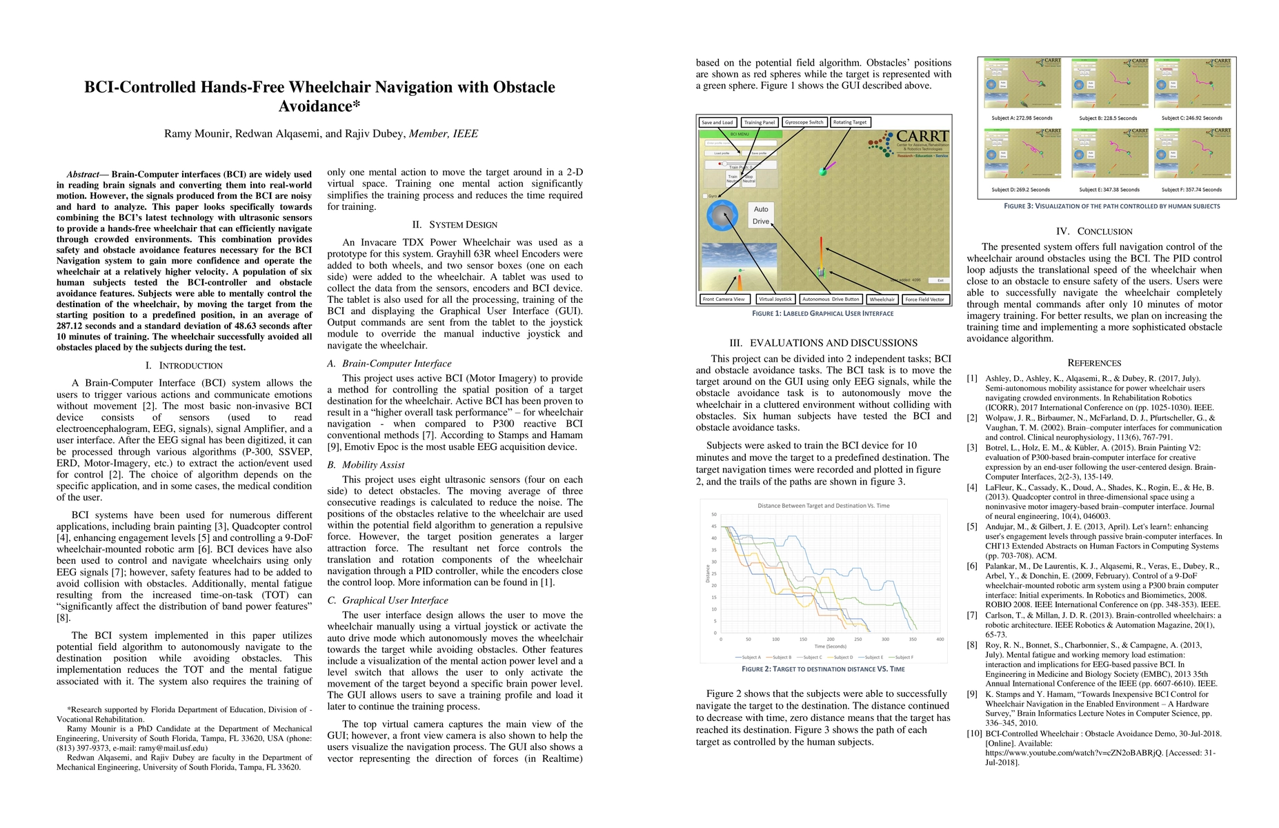 This paper explores a BCI-controlled wheelchair that integrates ultrasonic sensors for obstacle avoidance, enabling hands-free navigation. Six human subjects successfully navigated the wheelchair mentally, achieving obstacle avoidance and reaching a target in an average of 287.12 seconds post-training.