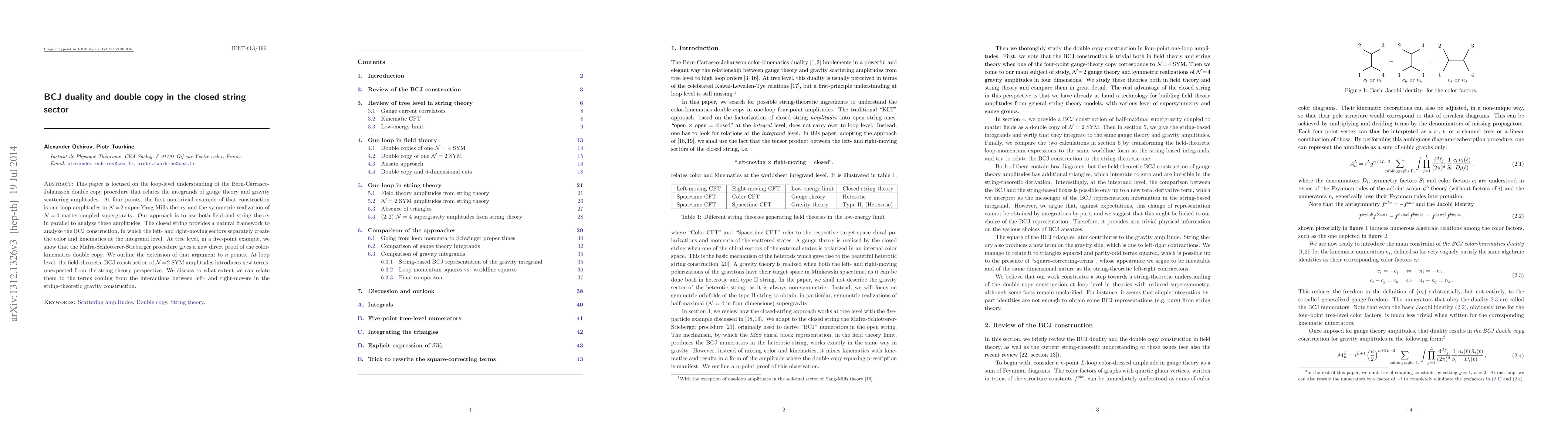 This paper is focused on the loop-level understanding of the Bern-Carrasco-Johansson double copy procedure that relates the integrands of gauge theory and gravity scattering amplitudes. At four points, the first non-trivial example of that construction is one-loop amplitudes in N=2 super-Yang-Mills theory and the symmetric realization of N=4 matter-coupled supergravity. Our approach is to use both field and string theory in parallel to analyze these amplitudes. The closed string provides a natural framework to analyze the BCJ construction, in which the left- and right-moving sectors separately create the color and kinematics at the integrand level. At tree level, in a five-point example, we show that the Mafra-Schlotterer-Stieberger procedure gives a new direct proof of the color-kinematics double copy. We outline the extension of that argument to n points. At loop level, the field-theoretic BCJ construction of N=2 SYM amplitudes introduces new terms, unexpected from the string theory perspective. We discuss to what extent we can relate them to the terms coming from the interactions between left- and right-movers in the string-theoretic gravity construction.