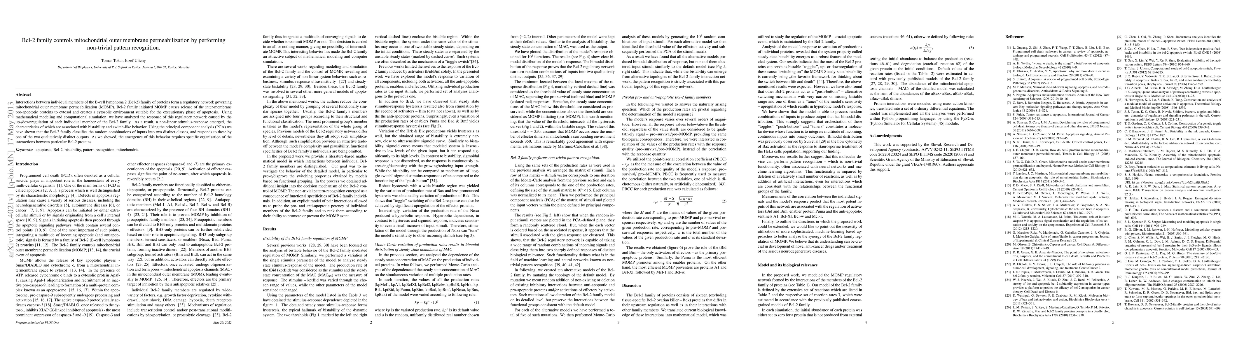 This paper investigates the regulatory network of Bcl-2 family proteins that control mitochondrial outer membrane permeabilization (MOMP), a key step in apoptosis. Through mathematical modeling and computational simulations, it reveals a non-linear stimulus-response pattern, characterized by bistability and switch-like behavior, indicating the Bcl-2 family's role in pattern recognition and classification of inputs into distinct classes.